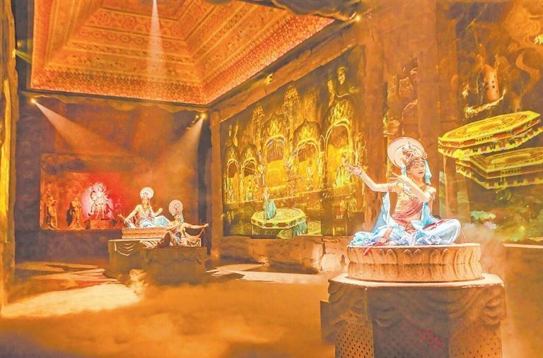 近年來,敦煌借助豐厚的旅游文化資源快速出圈,旅游項(xiàng)目供給不斷豐富,游客多樣化、高品質(zhì)的旅游需求不斷被滿足。其中《樂動(dòng)敦煌》作為全球首部洞窟式沉浸體驗(yàn)劇,自開演以來好評(píng)如潮。該劇在文化書寫、空間營造、科技賦能、審美引領(lǐng)、研學(xué)實(shí)訓(xùn)等方面逐步拓展旅游演藝新邊界。