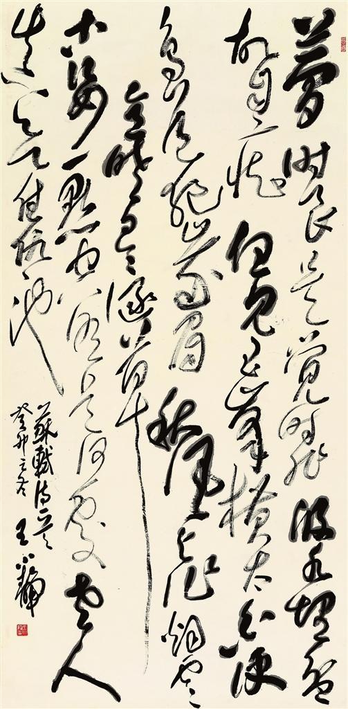 隴南有著得天獨(dú)厚的碑學(xué)資源,以《西狹頌》為代表的碑刻見證了隴南金石碑學(xué)的延續(xù)。王小靜書法中的篆隸素養(yǎng)即來自于此,她大量臨習(xí)金文、漢碑,取其古拙之趣,將碑學(xué)強(qiáng)調(diào)的線條運(yùn)用在草書中,涵養(yǎng)了草書的內(nèi)韻,在澎湃開張的草書體態(tài)中顯示出了厚重的體積感和塊面感,一張一弛之間將一種真正源于內(nèi)心對(duì)草書的熱愛凝結(jié)于紙面。從內(nèi)心情感對(duì)草書的萌動(dòng)到草書創(chuàng)作進(jìn)入自由抒情階段,這是一次漫長的學(xué)習(xí)之旅。王小靜一直在這條路上奮進(jìn),至今仍然堅(jiān)持臨摹古代經(jīng)典,尤其注重把對(duì)篆隸的臨摹推向深入。她認(rèn)為,不斷深入古代經(jīng)典,從傳統(tǒng)中尋找個(gè)人的創(chuàng)新空間,才是有價(jià)值的創(chuàng)新。