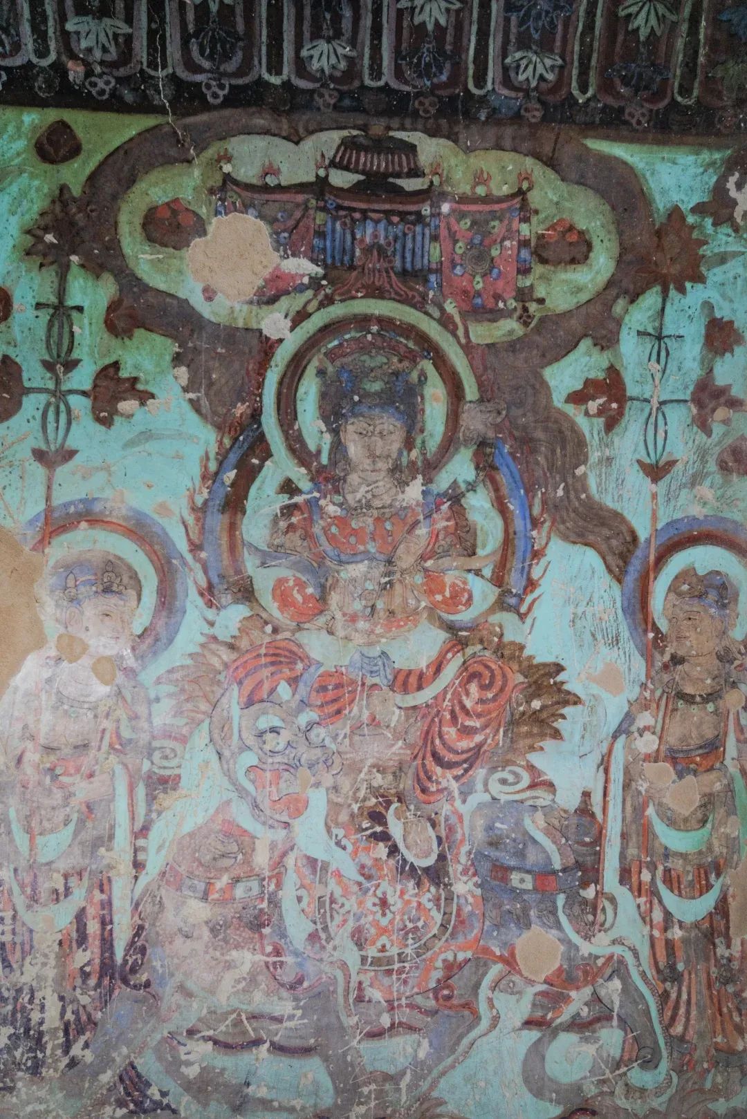 相傳,昌馬石窟由兩個先后云游到昌馬的僧人開鑿。1932年由于大地震,昌馬石窟大部分洞窟損毀,其中南、北兩段的7個窟龕多已殘破,僅中段4窟得以幸存,還留存著一些造像與壁畫。在中段的4個窟中,第一、三洞窟為敞口大龕和禪窟,遺存少,信息少。以第2窟和第4窟保存較為完整,這兩個洞窟的形制均屬于中心柱窟。昌馬石窟的造像題材主要有坐佛、脅侍菩薩、七佛、大菩薩行列、六臂觀音菩薩、彌勒菩薩、文殊菩薩赴會圖、普賢菩薩赴會圖、凈土經(jīng)變畫、飛天、供養(yǎng)香爐及獅子、火焰寶珠壺門、垂幔、團花紋或連珠紋或花卉等圖案。