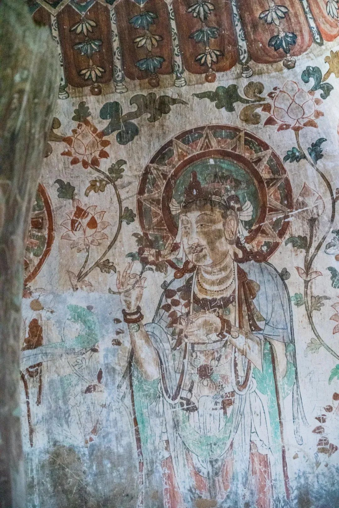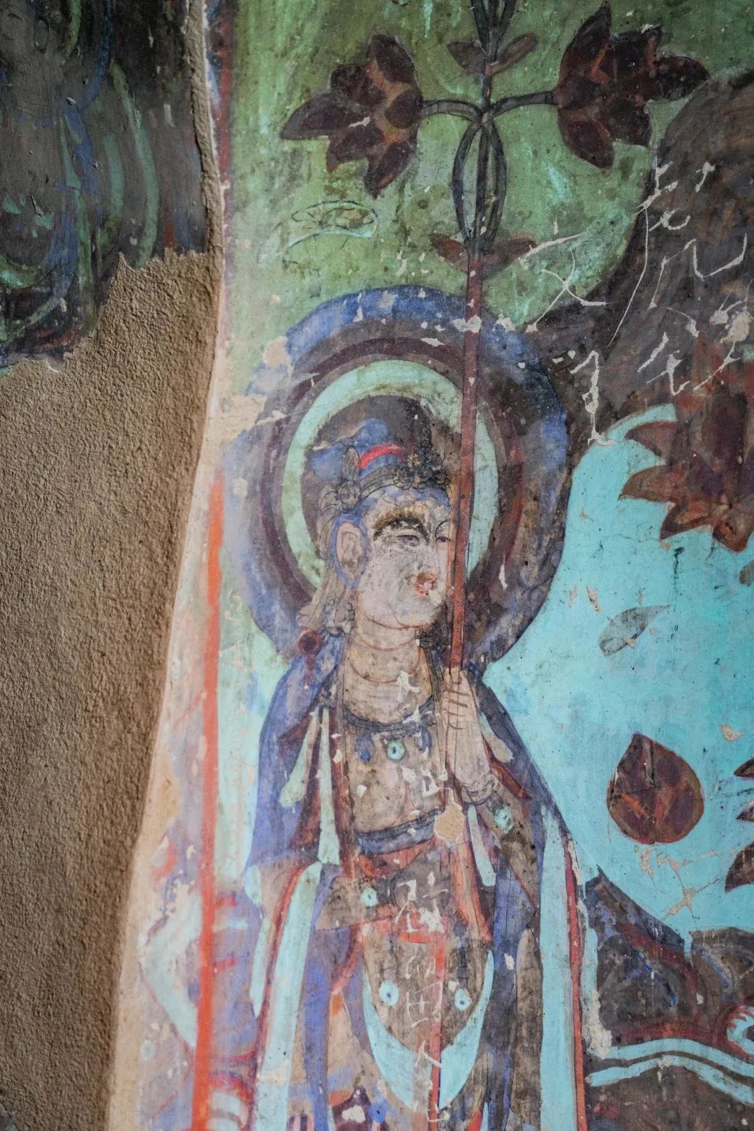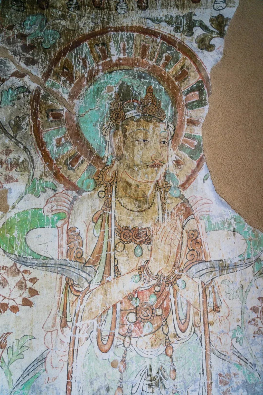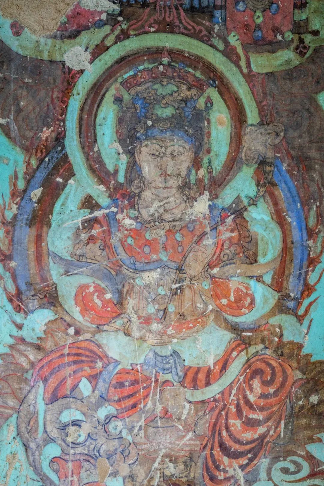 現(xiàn)在第4窟中早期塑像多數(shù)已毀,但仍殘存少數(shù)幾身,十分珍貴;各側(cè)面表層為西夏重修時繪制的壁畫;柱座與柱身的兩層自下而上逐層縮小;中心柱正面在西夏時改造成一橢圓形的大背屏,背屏正面表層為清代重繪的壁畫;四壁及頂上壁畫也多為西夏時期。