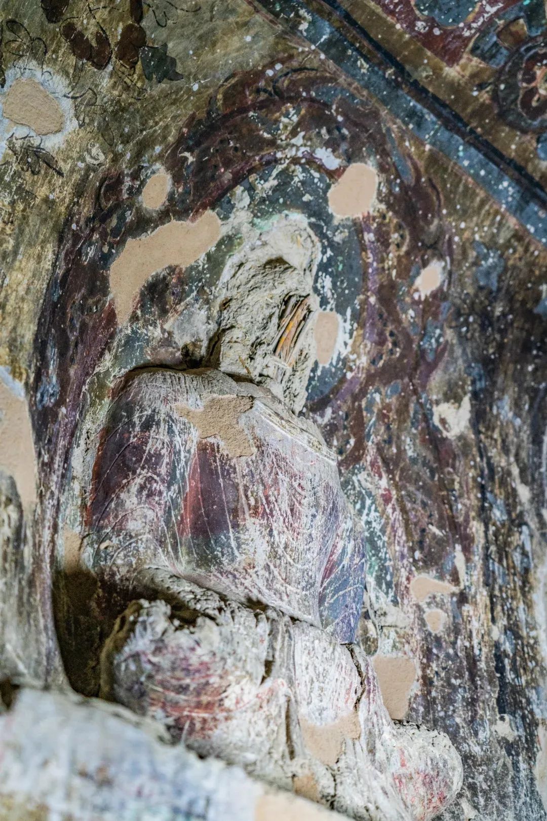 塑像題材為簡單的一佛二菩薩。內(nèi)塑一坐佛像,龕外兩側(cè)各塑一脅侍菩薩像,上層開—淺龕,中間塑一結(jié)跏趺坐佛像,面相渾圓,雙手攏于袈裟內(nèi),衣角垂于腹前,陰線刻衣紋。頭部均毀,露出麥草扎成的骨干。龕外兩側(cè)各塑一脅侍菩薩像,雙手合十,佩項圈、瓔珞,披帛搭于肩上,帛帶下垂外張。佛與菩薩,作風古樸,技法概括而又簡練,很接近敦煌莫高窟259窟,其時代可能為北涼時期。