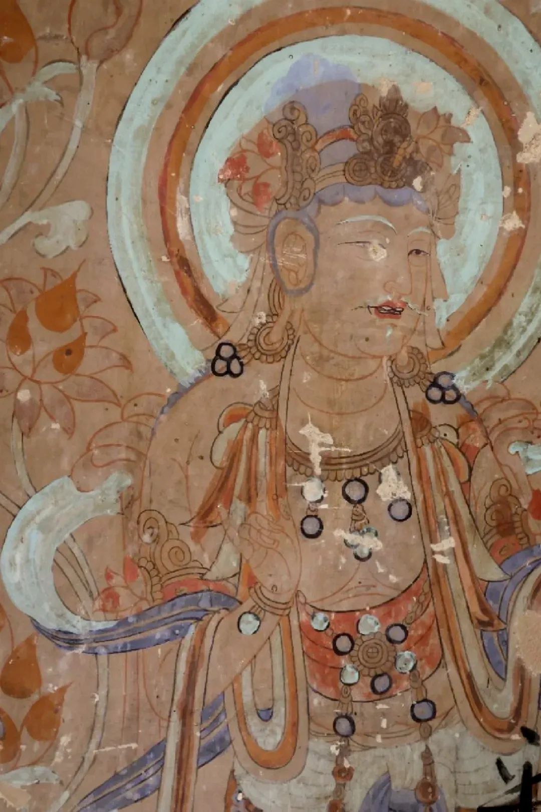 昌馬石窟第1、2、4窟表層西夏時期所繪壁畫的內(nèi)容,用色及菩薩的服裝等極接近敦煌莫高窟第328、327窟和榆林窟第17窟西夏壁畫。其用筆比較端莊拘謹,不似唐代自由流暢;用色以赭紅、大綠為主;人物造像尤其是菩薩形象程式化,菩薩衣飾華麗復雜,但神態(tài)略顯呆板,不似唐代優(yōu)美生動和神采煥發(fā);裝飾圖案繁縟化,這些都與敦煌莫高窟、瓜州榆林窟、肅北五個廟同時期的壁畫具有統(tǒng)一的時代風格。
