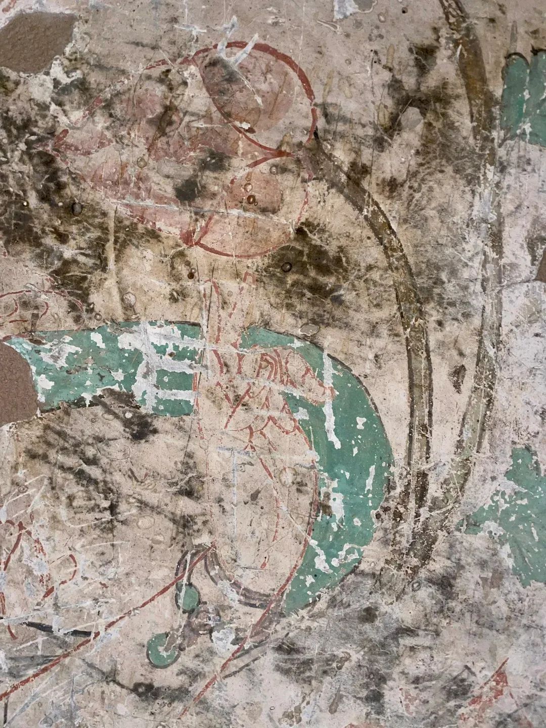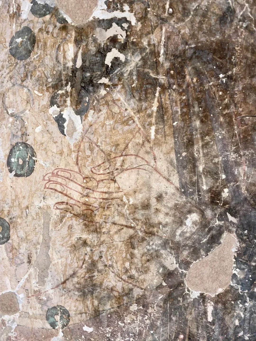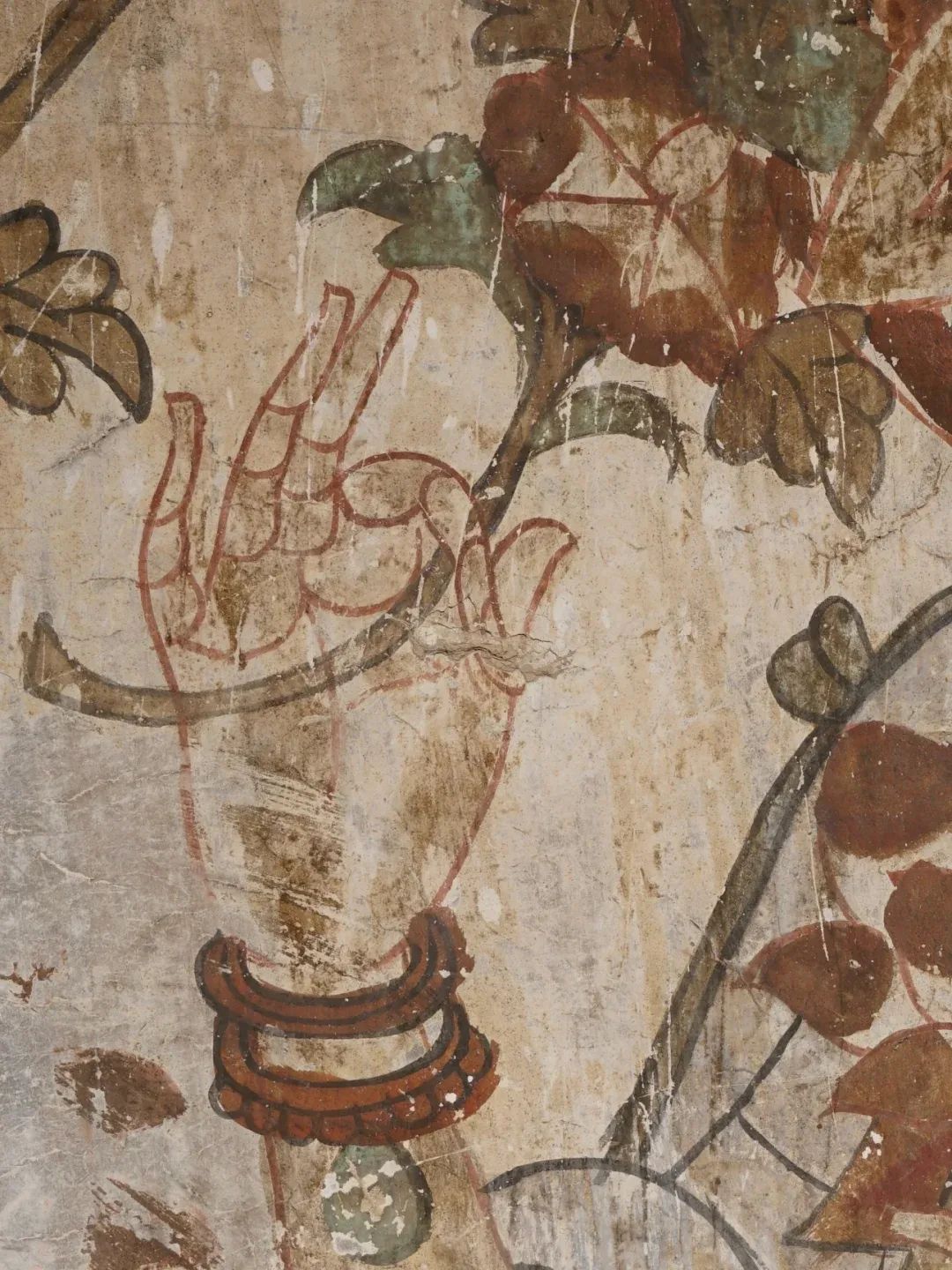 昌馬石窟第4窟洞窟形制及其殘存的塑像對于研究中國早期石窟藝術(shù)與佛教造像藝術(shù)極其重要??邇?nèi)壁畫內(nèi)容是四壁上方畫條式旌幡,下畫供養(yǎng)菩薩,身高近2米,今殘存20身,菩薩周圍畫纏枝蓮,與第二窟基本相同。窟頂前半部地仗大部分脫落,靠近中心柱正面上部右側(cè)的部位殘存龜形六瓣團花圖案與一身飛天及菊花紋圖案。后部中心柱頂部周圍窟頂表面繪龜形六瓣團花、連珠紋等圖案。