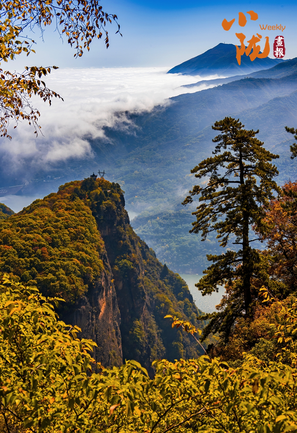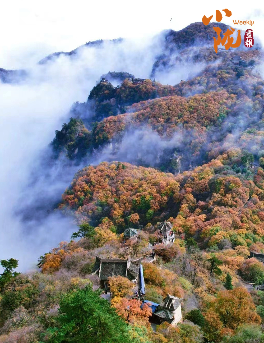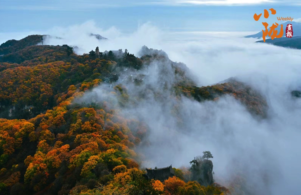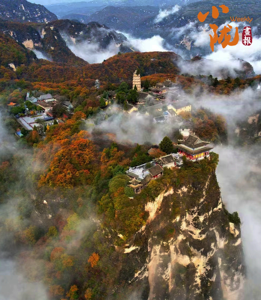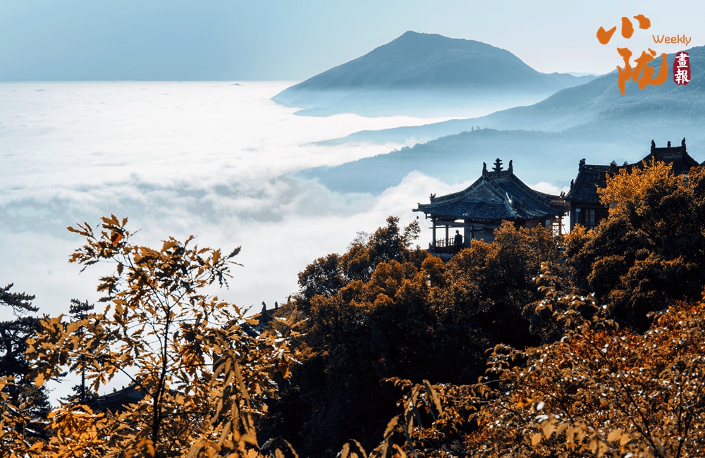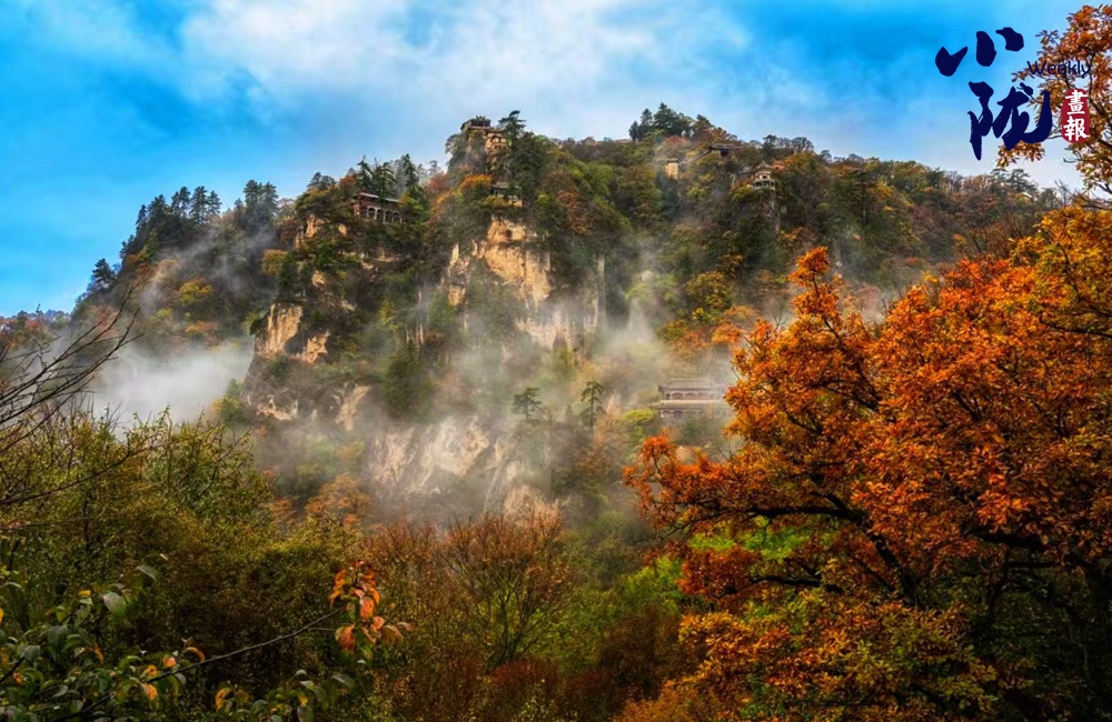 一葉知冬,遍地金黃。五彩斑斕的林木與古香古色的建筑、遠(yuǎn)處的山巒云霧相映成趣,盡顯詩(shī)意之美。