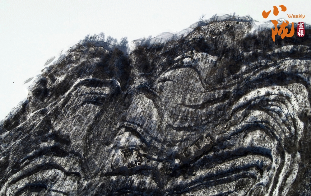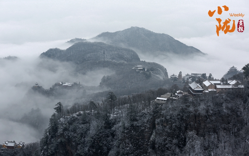 古建筑群在山雪映襯下,更顯古樸、神秘,常青樹木為冬日增添了生機。