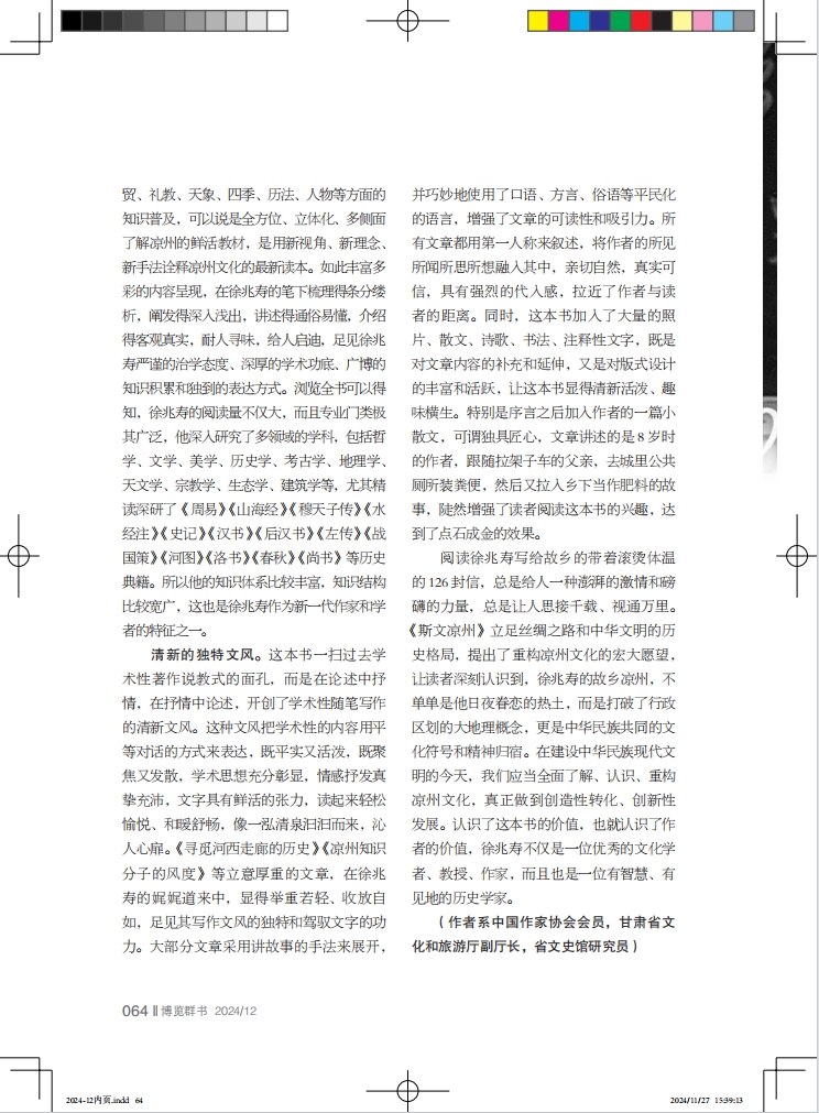 豐富的知識體系。這本學術性隨筆集,是徐兆壽近20年來教學、研究的成果體現,不但學術性強、抒情性濃,而且知識面廣,既有歷史、政治、文化、藝術等方面的內容解讀,又有民風、民俗、家訓、家教等方面的常識介紹,還有民居、服飾、飲食、農耕、商貿、禮教、天象、四季、歷法、人物等方面的知識普及,可以說是全方位、立體化、多側面了解涼州的鮮活教材,是用新視角、新理念、新手法詮釋涼州文化的最新讀本。如此豐富多彩的內容呈現,在徐兆壽的筆下梳理得條分縷析,闡發(fā)得深入淺出,講述得通俗易懂,介紹得客觀真實,耐人尋味,給人啟迪,足見徐兆壽嚴謹的治學態(tài)度、深厚的學術功底、廣博的知識積累和獨到的表達方式。瀏覽全書可以得知,徐兆壽的閱讀量不僅大,而且專業(yè)門類極其廣泛,他深入研究了多領域的學科,包括哲學、文學、美學、歷史學、考古學、地理學、天文學、宗教學、生態(tài)學、建筑學等,尤其精讀深研了《周易》《山海經》《穆天子傳》《水經注》《史記》《漢書》《后漢書》《左傳》《戰(zhàn)國策》《河圖》《洛書》《春秋》《尚書》等歷史典籍。所以他的知識體系比較豐富,知識結構比較寬廣,這也是徐兆壽作為新一代作家和學者的特征之一。