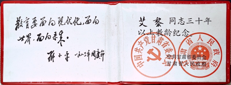 這是一本從教滿三十年的榮譽(yù)證書。由中共甘肅省委、甘肅省人民政府頒發(fā)。證書內(nèi)頁的左側(cè)是鄧小平1983年國慶節(jié)題寫的“教育要面向現(xiàn)代化,面向世界,面向未來”。右側(cè)是“艾黎同志三十年以上教齡紀(jì)念”。“三個面向”是為北京景山學(xué)校的題詞,是鄧小平提出的教育發(fā)展改革方針,旨在推動中國的教育現(xiàn)代化進(jìn)程,使其更加開放和適應(yīng)未來發(fā)展的需要,面向世界,吸收國際先進(jìn)的教育理念和經(jīng)驗(yàn);同時展望未來,培養(yǎng)適應(yīng)未來社會需要的人才。