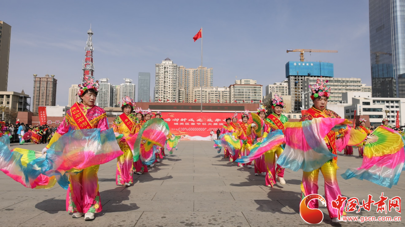 隨著開(kāi)場(chǎng)鑼鼓響起,廣場(chǎng)瞬間被喜慶氛圍包圍。大鼓與舞獅表演率先登場(chǎng),雄渾的鼓聲與靈動(dòng)的舞獅相得益彰,贏得觀眾陣陣喝彩。隨后,《妹妹的山丹花》以優(yōu)美的旋律和歡快的舞姿,生動(dòng)展現(xiàn)了西北地區(qū)的獨(dú)特風(fēng)情。