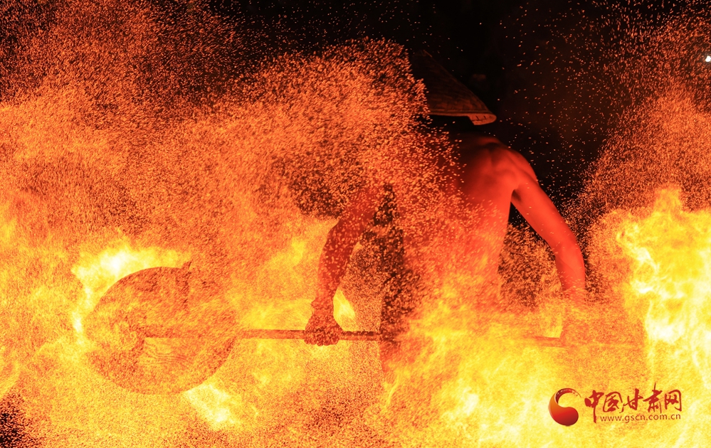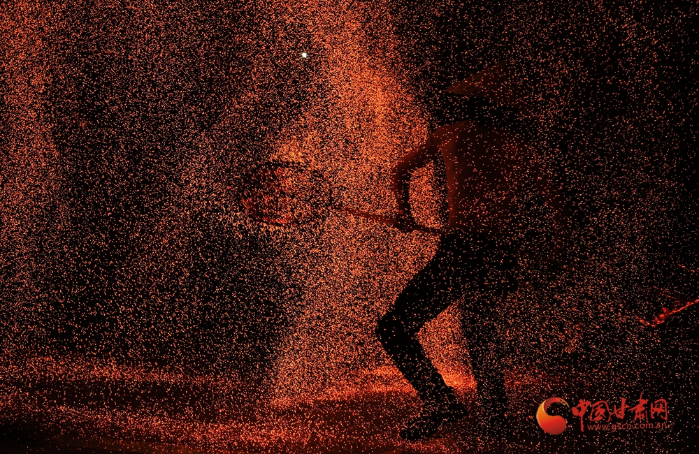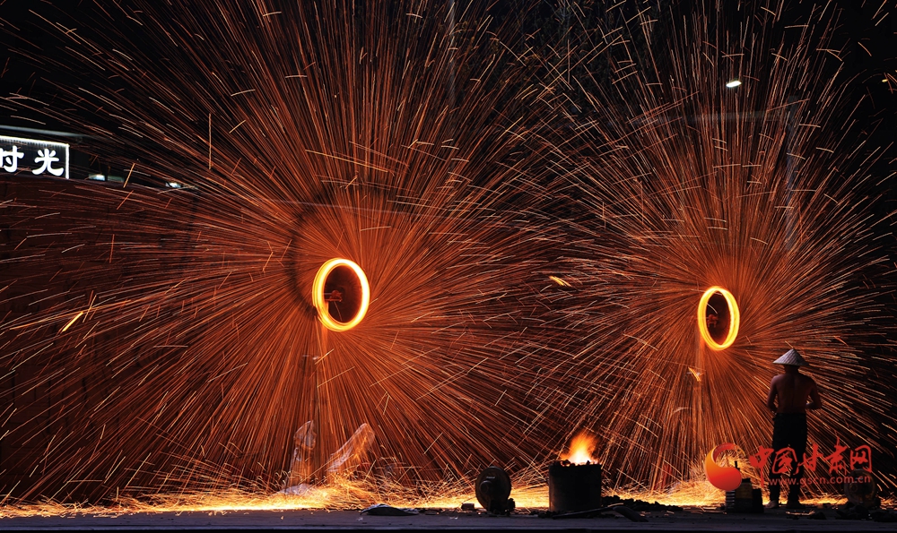 打鐵花表演時(shí),傳承人將生鐵熔到1600℃高溫后,把鐵汁注入“花棒”,用撬棍或木鍬猛擊,使鐵水打上天空四散,形成璀璨絢麗的火樹(shù)銀花景觀。