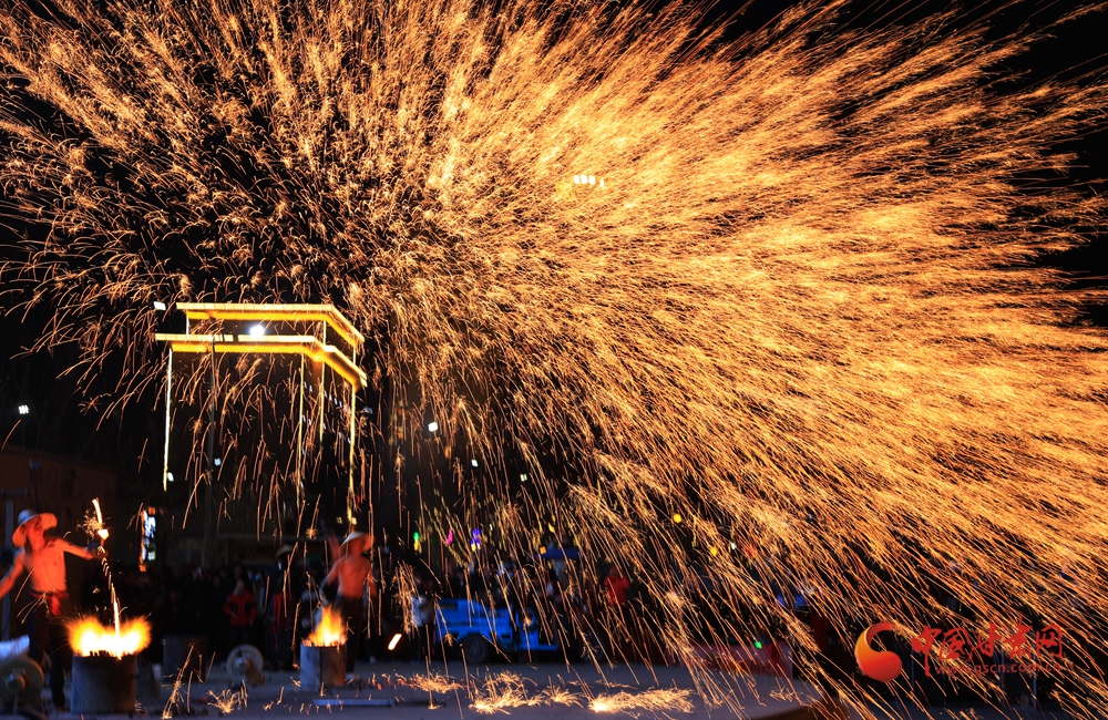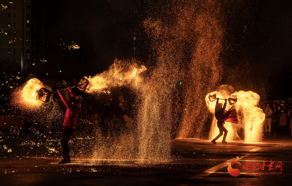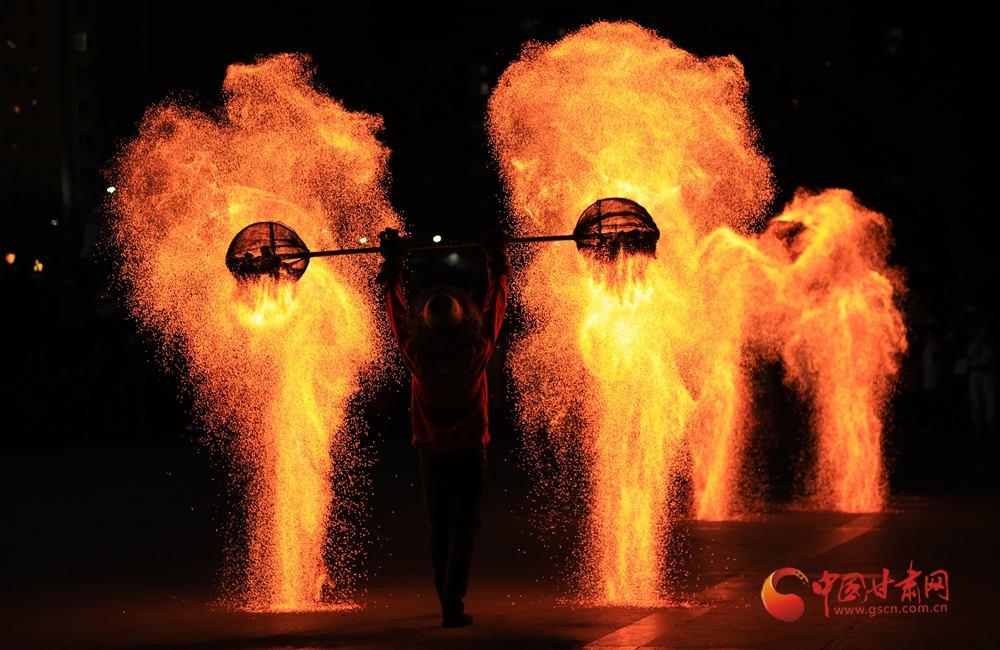 春節(jié)期間,在臨夏永靖劉家峽太極廣場(chǎng)上進(jìn)行的打鐵花和火壺表演吸引了不少觀眾,營(yíng)造了濃濃的節(jié)日氛圍。