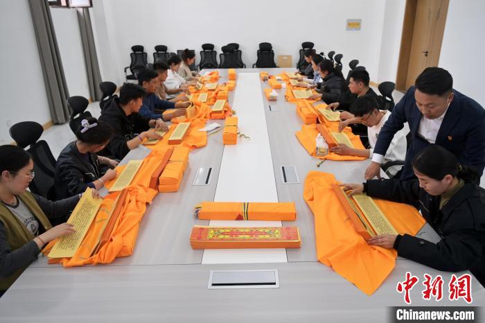 2月27日,在甘肅甘南藏族自治州碌曲縣益西達(dá)吉科技有限公司內(nèi),工作人員正在進(jìn)行藏文古籍?dāng)?shù)字化相關(guān)工作。該公司主要從事民族古籍?dāng)?shù)字化建設(shè)和古籍文獻(xiàn)數(shù)據(jù)庫(kù)建設(shè),自2019年以來,承擔(dān)西藏、四川、甘肅等省區(qū)的藏文古籍?dāng)?shù)字化項(xiàng)目。圖為工作人員對(duì)藏文古籍(木刻版)做數(shù)字化工作前期準(zhǔn)備。中新社記者 九美旦增 攝