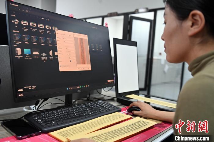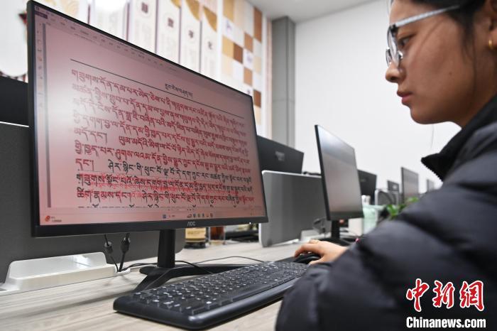 2月27日,在甘肅甘南藏族自治州碌曲縣益西達(dá)吉科技有限公司內(nèi),工作人員正在進(jìn)行藏文古籍?dāng)?shù)字化相關(guān)工作。該公司主要從事民族古籍?dāng)?shù)字化建設(shè)和古籍文獻(xiàn)數(shù)據(jù)庫(kù)建設(shè),自2019年以來,承擔(dān)西藏、四川、甘肅等省區(qū)的藏文古籍?dāng)?shù)字化項(xiàng)目。圖為工作人員用該公司研發(fā)的藏文信息處理系統(tǒng)對(duì)古籍?dāng)?shù)字化內(nèi)容進(jìn)行檢查。中新社記者 九美旦增 攝