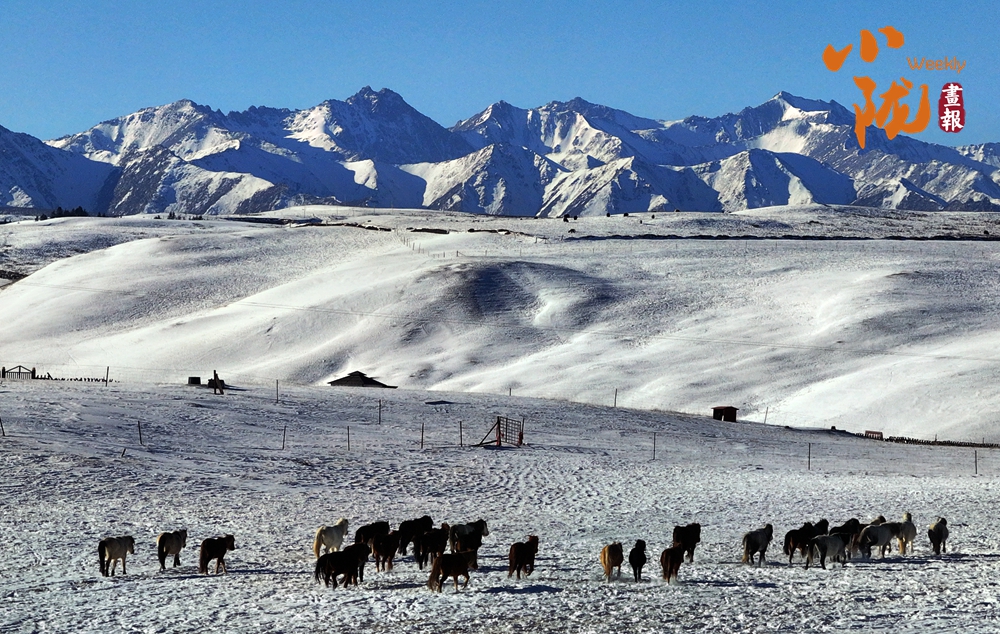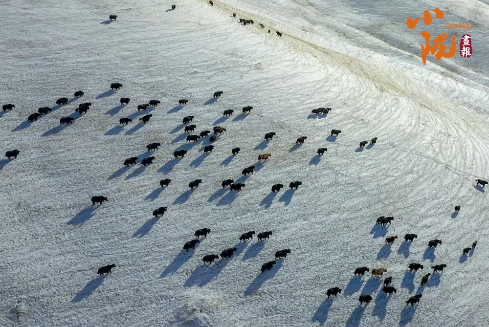 牛群在雪地中悠閑地覓食,和雪景相映成趣,給這片寧?kù)o的草原帶來(lái)了生機(jī)與活力。