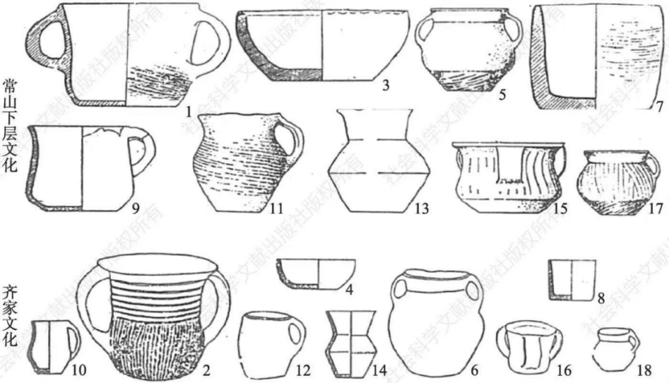 常山下層文化過去限于資料太少,對其研究進展緩慢,近年來很多學者研究有了新的突破。陶器在常山下層文化中獨具特色,橙黃色、紅褐色陶器搭配斜行籃紋,成為其顯著特征。諸多齊家文化器物,如豎行籃紋單耳罐、單耳杯、雙耳杯、侈口罐等,皆可在常山下層文化中尋得淵源,胡謙盈據此提出“常山下層文化是齊家文化的重要來源”,張忠培亦認為,常山下層文化的提出,有力推動了齊家文化淵源的研究。不過,學界對于齊家文化的起源尚存爭議,有人認為齊家文化是馬廠類型的的延續(xù)與發(fā)展,也有人認為是獨立發(fā)展而成,還有人認為是馬家窯文化發(fā)展到馬廠類型后分東西兩支,一支發(fā)展為河西的四壩文化,一支發(fā)展為齊家文化。韓建業(yè)先生認為齊家文化應當是客省莊二期文化西進隴東南并與菜園文化融合的結果,齊家文化早期的絕對年代約在公元前 2400-前 2200 年,這個時段在中國內地屬于銅石并用時代晚期,分布在天水一帶的遺存是齊家文化早期階段,常山下層文化絕對年代約在公元前2700-前2400年,相當于廟底溝二期階段,再向下就屬于齊家文化早期階段。 近年來,大多學者提出齊家文化源頭大致在隴東及寧夏南部,由東向西漸進擴展。