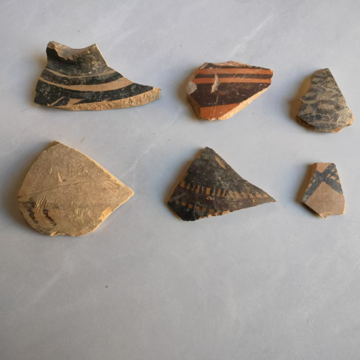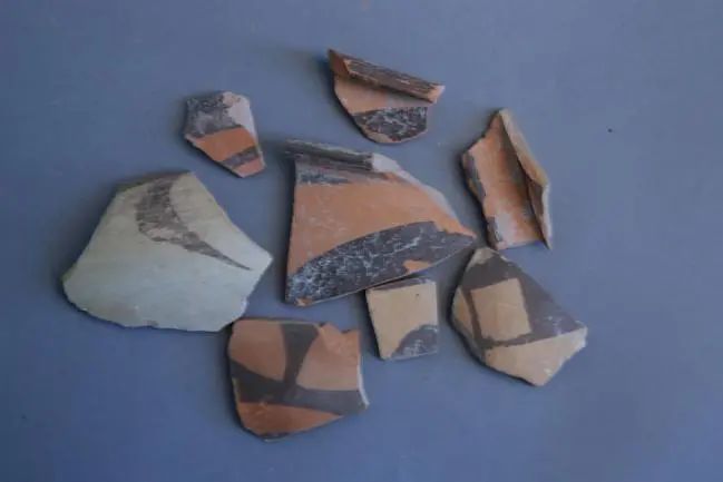 常山下層陶器的籃紋、彩陶和彩繪獨具特色?;@紋均橫行或斜行施于器壁,常見籃紋窄小且拍印深,可能是黃土高原溝壑地帶稀樹叢林藤條編織器物在陶器紋飾上的獨特反映。籃紋陶器大多器型精美且較大,如橙黃色籃紋高領深腹罐,當屬上流社會使用的器物。彩陶以赤砂石為顏料,因顏料調和濃度大且未經壓磨,棕紅色彩紋直接裸露于器皿壁面,與仰韶、馬家窯等文化彩陶著彩后壓磨光滑的工藝截然不同。彩繪所用顏料與色澤雖與彩陶相同,但彩繪施于燒制后的器皿上,極易脫落。