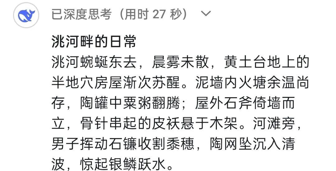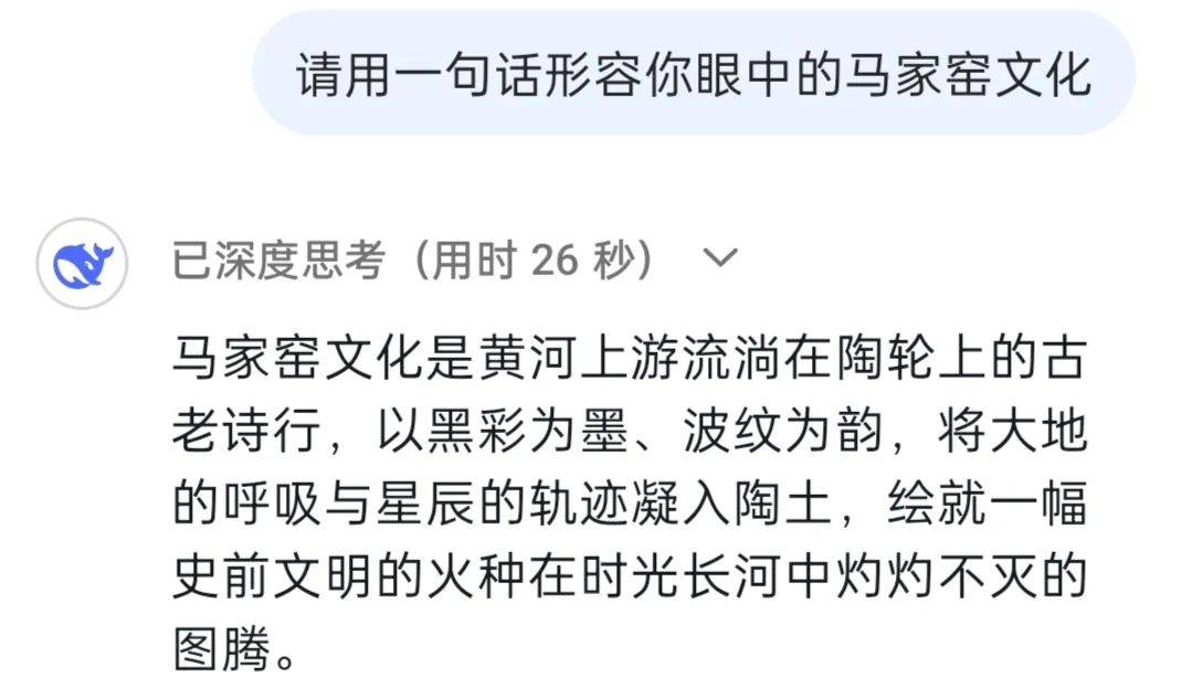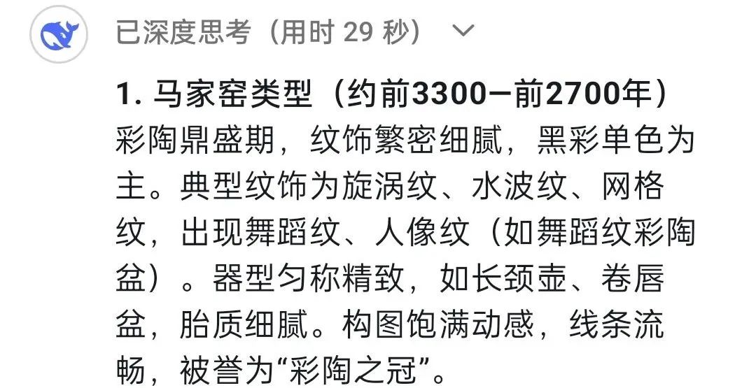 DeepSeek:馬家窯文化作為人類文明長河中一顆璀璨的明珠,因最早發(fā)現(xiàn)于甘肅省臨洮縣馬家窯村而得名,它被認(rèn)為是仰韶文化向西發(fā)展的延續(xù),它展現(xiàn)了黃河上游先民的創(chuàng)造力,更是史前人類與自然對話、與社會共生的見證。