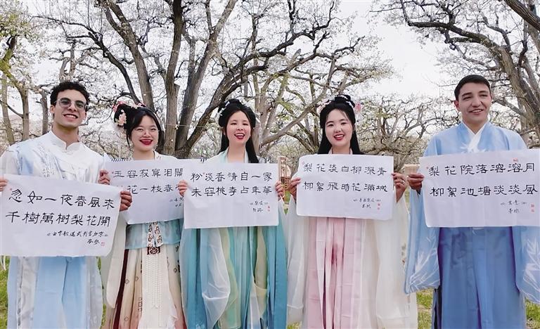 在接下來的詩詞互動(dòng)環(huán)節(jié),外籍留學(xué)生開啟換裝模式,身著漢服,徜徉在梨花樹下,吟誦著“梨花”主題的詩句,感受中國漢服之美和中國傳統(tǒng)文化的魅力。換裝后的外籍留學(xué)生也讓梨園秒變“出片現(xiàn)場”。“這是我第一次穿漢服,穿著漢服在梨園里拍的照片真的很好看。”來自越南的黃青草,迫不及待地想把這份梨園的浪漫春日記憶分享給自己的同學(xué)、朋友。