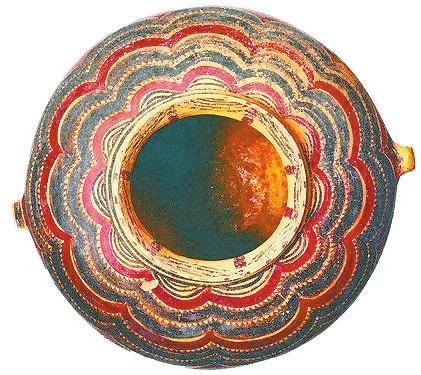其中以馬家窯文化彩陶為代表,蘊(yùn)含著眾多神秘的社會(huì)文化信息,以線條作為造型手段、以黑色(墨色)作為主要基調(diào),奠定了中國畫發(fā)展的歷史基礎(chǔ)與以線描為特征的基本形式。馬家窯文化彩陶也是中國音樂舞蹈的開端呈現(xiàn)。1973年,甘青地區(qū)大通縣出土的馬家窯文化彩陶舞蹈紋盆,內(nèi)壁繪舞蹈人物3組,每組5人,令人感受到遠(yuǎn)古舞蹈強(qiáng)烈的節(jié)奏感。1991年,甘肅武威市發(fā)現(xiàn)的彩陶舞蹈紋盆,內(nèi)壁繪有兩組手拉手的舞蹈人物,每組9人,舞蹈人數(shù)更多。1995年,宗日遺址再次出土一件馬家窯文化彩繪舞蹈紋盆,內(nèi)壁所繪舞蹈人物兩組,分別為11人和13人,給人一種優(yōu)雅的舞蹈意境。1986年,甘肅省永登縣出土馬家窯文化的彩陶鼓。這些珍貴的彩陶器物成為研究中國原始歌舞和音樂起源的佐證。