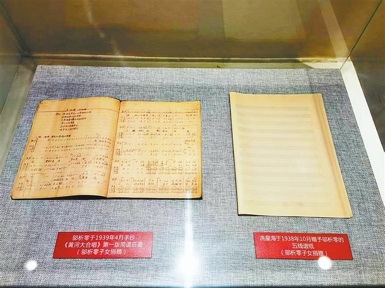 記者在《黃河大合唱》展覽館看到,展出的鄔析零1939年4月手抄《黃河大合唱》第一版簡(jiǎn)譜總譜,字跡小而工整,旁邊還陳展著幾頁(yè)五線譜紙,那是冼星海從巴黎帶回來(lái),自己舍不得用,送給鄔析零的,而鄔析零也沒(méi)舍得用,就留存到了現(xiàn)在。這,都是歷史的見(jiàn)證。