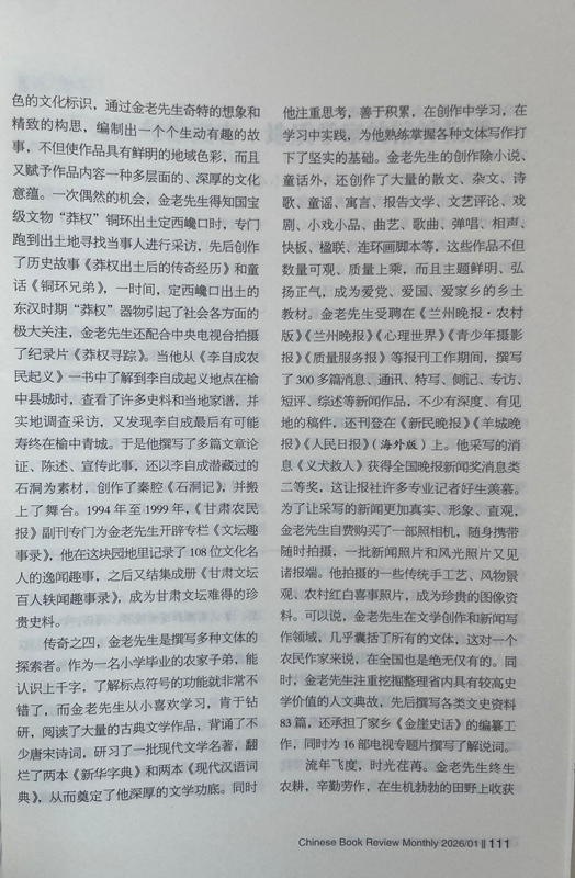 傳奇之四,金老先生是撰寫多種文體的探索者。作為一名小學(xué)畢業(yè)的農(nóng)家子弟,能認(rèn)識上千字,了解標(biāo)點(diǎn)符號的功能就非常不錯(cuò)了,而金老先生從小喜歡學(xué)習(xí),肯于鉆研,閱讀了大量的古典文學(xué)作品,背誦了不少唐宋詩詞,研習(xí)了一批現(xiàn)代文學(xué)名著,翻爛了兩本《新華字典》和兩本《現(xiàn)代漢語詞典》,從而奠定了他深厚的文學(xué)功底。同時(shí)他注重思考,善于積累,在創(chuàng)作中學(xué)習(xí),在學(xué)習(xí)中實(shí)踐,為他熟練掌握各種文體寫作打下了堅(jiān)實(shí)的基礎(chǔ)。金老先生的創(chuàng)作除小說、童話外,還創(chuàng)作了大量的散文、雜文、詩歌、童謠、寓言、報(bào)告文學(xué)、文藝評論、戲劇、小戲小品、曲藝、歌曲、彈唱、相聲、快板、楹聯(lián)、連環(huán)畫腳本等,這些作品不但數(shù)量可觀、質(zhì)量上乘,而且主題鮮明、弘揚(yáng)正氣,成為愛黨、愛國、愛家鄉(xiāng)的鄉(xiāng)土教材。金老先生受聘在《蘭州晚報(bào)·農(nóng)村版》《蘭州晚報(bào)》《心理世界》《青少年攝影報(bào)》《質(zhì)量服務(wù)報(bào)》等報(bào)刊工作期間,撰寫了300多篇消息、通訊、特寫、側(cè)記、專訪、短評、綜述等新聞作品,不少有深度、有見地的稿件,還刊登在《新民晚報(bào)》《羊城晚報(bào)》《人民日報(bào)》(海外版)上。他采寫的消息《義犬救人》獲得全國晚報(bào)新聞獎(jiǎng)消息類二等獎(jiǎng),這讓報(bào)社許多專業(yè)記者好生羨慕。為了讓采寫的新聞更加真實(shí)、形象、直觀,金老先生自費(fèi)購買了一部照相機(jī),隨身攜帶隨時(shí)拍攝,一批新聞?wù)掌惋L(fēng)光照片又見諸報(bào)端。他拍攝的一些傳統(tǒng)手工藝、風(fēng)物景觀、農(nóng)村紅白喜事照片,成為珍貴的圖像資料??梢哉f,金老先生在文學(xué)創(chuàng)作和新聞寫作領(lǐng)域,幾乎囊括了所有的文體,這對一個(gè)農(nóng)民作家來說,在全國也是絕無僅有的。同時(shí),金老先生注重挖掘整理省內(nèi)具有較高史學(xué)價(jià)值的人文典故,先后撰寫各類文史資料83篇,還承擔(dān)了家鄉(xiāng)《金崖史話》的編纂工作,同時(shí)為16部電視專題片撰寫了解說詞。