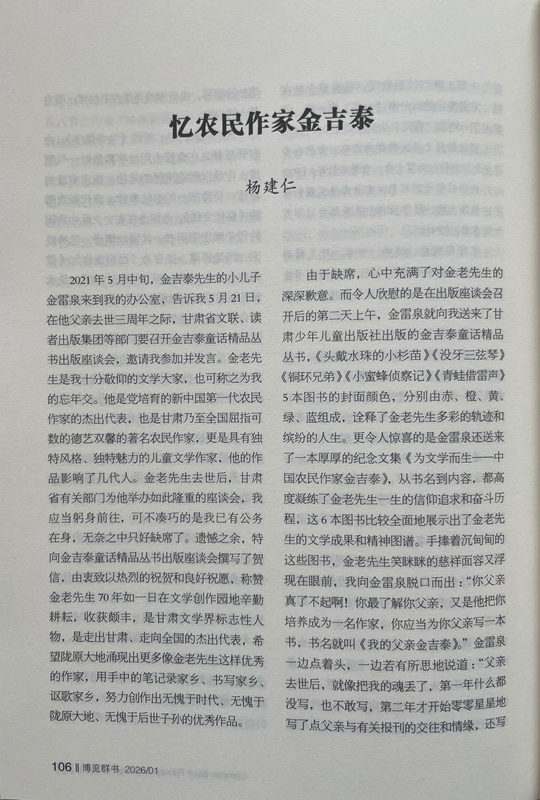 由于缺席,心中充滿了對金老先生的深深歉意。而令人欣慰的是在出版座談會召開后的第二天上午,金雷泉就向我送來了甘肅少年兒童出版社出版的金吉泰童話精品叢書,《頭戴水珠的小杉苗》《沒牙三弦琴》《銅環(huán)兄弟》《小蜜蜂偵察記》《青蛙借雷聲》5本圖書的封面顏色,分別由赤、橙、黃、綠、藍(lán)組成,詮釋了金老先生多彩的軌跡和繽紛的人生。更令人驚喜的是金雷泉還送來了一本厚厚的紀(jì)念文集《為文學(xué)而生——中國農(nóng)民作家金吉泰》,從書名到內(nèi)容,都高度凝練了金老先生一生的信仰追求和奮斗歷程,這6本圖書比較全面地展示出了金老先生的文學(xué)成果和精神圖譜。手捧著沉甸甸的這些圖書,金老先生笑瞇瞇的慈祥面容又浮現(xiàn)在眼前,我向金雷泉脫口而出:“你父親真了不起啊!你最了解你父親,又是他把你培養(yǎng)成為一名作家,你應(yīng)當(dāng)為你父親寫一本書,書名就叫《我的父親金吉泰》。”金雷泉一邊點(diǎn)著頭,一邊若有所思地說道:“父親去世后,就像把我的魂丟了,第一年什么都沒寫,也不敢寫,第二年才開始零零星星地寫了點(diǎn)父親與有關(guān)報(bào)刊的交往和情緣,還寫了點(diǎn)父親在生活和寫作中的軼事趣聞。您的建議非常好,我擔(dān)心駕馭不好,試試看吧。”我感覺金雷泉有點(diǎn)為難,馬上又安慰他:“不急,你用兩三年時(shí)間慢慢寫。”