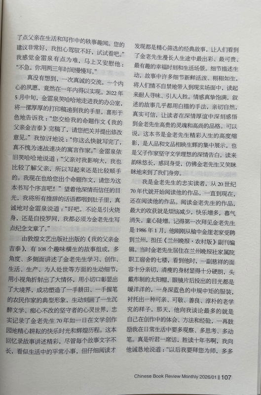 由敦煌文藝出版社出版的《我的父親金吉泰》,有108個(gè)趣味橫生的故事組成,多角度、多側(cè)面講述了金老先生學(xué)習(xí)、創(chuàng)作、生活、生產(chǎn)、為人處世等方面的生動細(xì)節(jié),用小視角折射出了大情懷,用小切口彰顯出了大境界,成功塑造了一手耕田、一手握筆的農(nóng)民作家的典型形象,生動刻畫了一生沉醉文學(xué)、癡心不改的堅(jiān)守者的心靈世界,忠實(shí)記錄了金老先生70年如一日在文學(xué)創(chuàng)作園地精心耕耘的快樂時(shí)光和輝煌歷程。這本回憶錄故事講述精彩,盡管每個(gè)故事文字不長,看似生活中的平常小事,但仔細(xì)閱讀才發(fā)現(xiàn)都是精心篩選的經(jīng)典故事,讓人們看到了金老先生漫長人生途中最出彩、最可貴、最有趣的幸福時(shí)刻和生活場景。細(xì)節(jié)描述生動,故事中許多細(xì)節(jié)新鮮活潑、栩栩如生,將人們情不自禁地帶入到現(xiàn)實(shí)場面中,讀起來耐人尋味、引人入勝。情感真摯飽滿,敘述的故事幾乎都用白描的手法,親切自然,真實(shí)可信,讓讀者在深情厚誼中深刻感悟到金老先生高貴的靈魂和高尚的品格??梢哉f,這本書是金老先生精彩人生的高度縮影,是人品和文品相映生輝的集中展示,也是父子作家堅(jiān)守文學(xué)理想的深情告白,讀來韻味悠長,感同身受,仿佛金老先生又笑瞇瞇地來到了我們身旁。