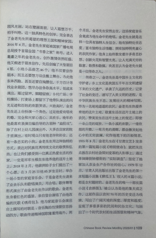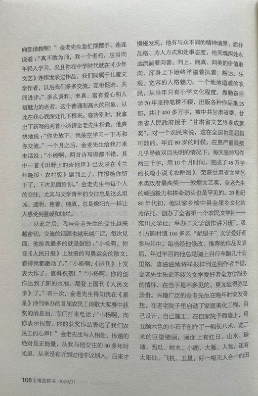 從此之后,我與金老先生的交往越來越密切,交流的話題也越來越廣泛,每次見面,他給我最多的就是鼓勵(lì):“小楊啊,你在《人民日報(bào)》上發(fā)表的寫奧運(yùn)會的散文,看得我都激動了。”“小楊啊,《詩刊》上發(fā)表大作了,值得祝賀!”“小楊啊,你的創(chuàng)作達(dá)到了新的水準(zhǔn),都登上國刊《人民文學(xué)》了。”有一次,金老先生得知我在《星星》詩刊舉辦的首屆農(nóng)民工詩歌大獎(jiǎng)賽中獲獎(jiǎng)的消息后,專門打來電話:“小楊啊,向你表示祝賀,你的獲獎(jiǎng)作品表達(dá)了我們農(nóng)民工的心聲!”金老先生與人相處,傳遞的絕對是正能量,從我與他交往的30多年時(shí)光里,從來沒有聽到過他非議別人。后來才慢慢發(fā)現(xiàn),他有與眾不同的精神境界、質(zhì)樸品格、為人方式和處事態(tài)度,他靈魂深處永遠(yuǎn)流淌著向善、向上、向真、向美的價(jià)值取向,渾身上下始終洋溢著執(zhí)著、豁達(dá)、樂觀、寬容的人格魅力。一個(gè)地地道道的農(nóng)民,從當(dāng)年只有小學(xué)文化程度,靠勤奮自學(xué)70年堅(jiān)持筆耕不輟,出版各種作品集25部,共計(jì)400多萬字,被中共甘肅省委、甘肅省人民政府授予“甘肅省文藝終身成就獎(jiǎng)”。對一個(gè)農(nóng)民來說,這在全國也是屈指可數(shù)的。年近80歲的時(shí)候,在患嚴(yán)重眼疾幾乎導(dǎo)致雙目失明的情況下,每天堅(jiān)持寫作兩三千字,用10個(gè)月時(shí)間,完成了45萬字的長篇小說《農(nóng)耕圖》,榮獲甘肅省文學(xué)藝術(shù)類政府最高獎(jiǎng)——敦煌文藝獎(jiǎng),金老先生的頑強(qiáng)毅力和拼命勁頭也是罕見的。20世紀(jì)80年代初,他以家鄉(xiāng)榆中縣金崖鄉(xiāng)文化站為依托,創(chuàng)辦了全省第一個(gè)農(nóng)民文學(xué)社——苑川文學(xué)社,舉辦“文學(xué)創(chuàng)作講習(xí)班”,吸引方圓村鎮(zhèn)100多名“泥腿子”文學(xué)愛好者參與其中,每當(dāng)經(jīng)他修改、推薦的作品發(fā)表后,年過半百的他總是騎上自行車跑幾十公里路,喜滋滋地將樣報(bào)樣刊送到作者手里,金老先生樂此不疲為文學(xué)愛好者全方位服務(wù)的情懷,在當(dāng)下是不多見的,更加顯得彌足珍貴。興趣廣泛的金老先生在晚年時(shí)突發(fā)奇想,在老宅院子里啟動了家庭美化工程,自己設(shè)計(jì)、自己施工,在自家院子西墻上,用五顏六色的小石子創(chuàng)作了一幅長八米、寬二米的巨型壁畫,畫面上有紅日、山水、碌碡、西瓜、樹木、小鹿、大雁、人物,還有太陽灶、飛機(jī)、衛(wèi)星,好一幅天人合一的田園風(fēng)光畫。站在壁畫面前,讓人遐想萬千、拍手叫絕,這一獨(dú)具特色的創(chuàng)舉,完全表達(dá)了金老先生所渴望的理想王國和精神家園。2014年4月,金老先生家庭被國家廣播電視總局授予首屆全國“書香之家”稱號。進(jìn)入耄耋之年的金老先生,創(chuàng)作激情依然旺盛,他又癡迷于劇本創(chuàng)作,先后創(chuàng)編了大型劇目4部,小戲小品曲藝46個(gè)。他不僅要?jiǎng)?chuàng)作劇本,而且還要想方設(shè)法搬上舞臺。為此他東奔西跑,甚至還要自掏腰包,千方百計(jì)尋找業(yè)余劇團(tuán),想盡辦法爭取高水平、低成本演出。雁過留聲,腳踏留痕,鄉(xiāng)村廣場、學(xué)校操場、打麥場上都留下了他帶隊(duì)演出的閃光足跡和百姓的歡歌笑語。興致高時(shí),金老先生還上臺扮演一個(gè)角色,過足他愛戲唱戲的癮,完全和大家心連心、共歡樂。晚年的他最喜歡表演自編自導(dǎo)的古劇種“扁擔(dān)戲”,除了在村上幼兒園演出外,大多在自家的院子里演出,有時(shí)觀眾只有他老伴和孫女,還有一條忠實(shí)的小狗。金老先生用這種獨(dú)特的方式,表達(dá)對民族優(yōu)秀傳統(tǒng)文化的敬畏和弘揚(yáng),也讓我們感受到一位真正熱愛生活的作家,一定是牢牢生根在生他養(yǎng)他的這片土地上。2018年2月,他破例給子女們提出了一個(gè)心愿,在3月25日他85歲生日時(shí),舉辦一場小型的家庭音樂會。于是金老先生請來了業(yè)余樂隊(duì)和歌唱演員,用合唱、歌伴舞等形式演出了由金老先生作詞的歌曲。金老先生身著紅色的盛裝,親自登臺演唱了由他改編的民歌《繡荷包》。他為家庭音樂會演出臺上撰寫的對聯(lián)是:音樂陶冶性情管弦悠揚(yáng)動四方,歌曲傳遞精神國歌隆重傳海外。兩個(gè)月后,金老先生安然去世,這場家庭音樂會竟成為他生命中的絕唱。金老先生就是這樣一位具有獨(dú)特人生信念、抱有獨(dú)特處世態(tài)度、富有獨(dú)特生活情趣、擁有獨(dú)特明亮童心的農(nóng)民作家,他身上始終散發(fā)著許多奇思妙想、創(chuàng)新火花和智慧光亮,讓人充滿無窮的敬意、敬畏和敬佩,我甚至認(rèn)為金老先生就是一位傳奇之人。
