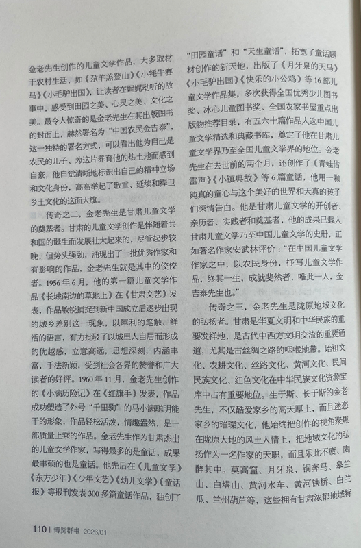 傳奇之二,金老先生是甘肅兒童文學(xué)的奠基者。甘肅的兒童文學(xué)創(chuàng)作是伴隨著共和國的誕生而發(fā)展壯大起來的,盡管起步較晚,但勢頭強(qiáng)勁,涌現(xiàn)出了一批優(yōu)秀作家和有影響的作品,金老先生就是其中的佼佼者。1956年6月,他的第一篇兒童文學(xué)作品《長城南邊的草地上》在《甘肅文藝》發(fā)表,作品敏銳捕捉到新中國成立后逐步出現(xiàn)的城鄉(xiāng)差別這一現(xiàn)象,以犀利的筆觸、鮮活的語言,有力批駁了以城里人自居而形成的優(yōu)越感,立意高遠(yuǎn),思想深刻,內(nèi)涵豐富,手法新穎,受到社會各界的贊譽(yù)和廣大讀者的好評。1960年11月,金老先生創(chuàng)作的《小滿歷險(xiǎn)記》在《紅旗手》發(fā)表,作品成功塑造了外號“千里駒”的馬小滿聰明能干的形象,作品輕松活潑,情趣盎然,是一部質(zhì)量上乘的作品。金老先生作為甘肅杰出的兒童文學(xué)作家,寫得最多的是童話,成果最豐碩的也是童話。他先后在《兒童文學(xué)》《東方少年》《少年文藝》《幼兒文學(xué)》《童話報(bào)》等報(bào)刊發(fā)表300多篇童話作品,獨(dú)創(chuàng)了“田園童話”和“天生童話”,拓寬了童話題材創(chuàng)作的新天地,出版了《月牙泉的天馬》《小毛驢出國》《快樂的小公雞》等16部兒童文學(xué)作品集,多次獲得全國優(yōu)秀少兒圖書獎(jiǎng)、冰心兒童圖書獎(jiǎng)、全國農(nóng)家書屋重點(diǎn)出版物推薦目錄,有五六十篇作品入選中國兒童文學(xué)精選和典藏書庫,奠定了他在甘肅兒童文學(xué)界乃至全國兒童文學(xué)界的地位。金老先生在去世前的兩個(gè)月,還創(chuàng)作了《青蛙借雷聲》《小鎮(zhèn)典故》等6篇童話,他用一顆純真的童心與這個(gè)美好的世界和天真的孩子們深情告白。他是甘肅兒童文學(xué)的開創(chuàng)者、親歷者、實(shí)踐者和奠基者,他的成果已載入甘肅兒童文學(xué)乃至中國兒童文學(xué)的史冊,正如著名作家安武林評價(jià):“在中國兒童文學(xué)作家之中,以農(nóng)民身份,抒寫兒童文學(xué)作品,終其一生,成就斐然者,唯此一人,金吉泰先生也。”