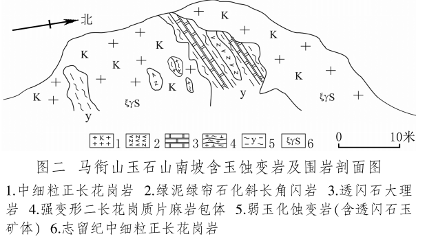 馬銜山玉礦分布在馬銜山東南部的玉石山(圖版一),海拔3028米。山上出露的地質體主要為古元古界馬銜山巖群、中元古代片麻二長花崗質巖[3]和志留紀正長花崗巖及正長巖。馬銜山巖群的巖性為黑云斜長片麻巖、變粒巖、斜長角閃巖和白云質大理巖,巖石普遍遭受了韌性變形,變余糜稜巖發(fā)育。志留紀巖漿侵入期后熱液活動較強,石英脈細脈發(fā)育,局部見螢石礦化或礦床[4]。玉礦化主要產于馬銜山巖群與志留紀正長花崗巖和正長巖接觸帶上(圖版二),具體賦存在與白云質大理巖的接觸部位,是正長花崗巖及正長巖與鎂質大理巖接觸交代蝕變的產物[5]?;◢弾r與片麻巖、變粒巖和斜長角閃巖接觸界線附近巖石雖有蝕變,但不見玉化蝕變巖或玉石出露。在近山頂開采玉石揭露的一個地質剖面清晰地顯示了這些特征(圖二)。該剖面大致呈東西走向,長約50米,馬銜山巖群多呈殘留體出露,斜長角閃巖綠泥綠簾石化強烈,大理巖普遍發(fā)生蝕變,形成透輝透閃石大理巖,緊靠花崗巖接觸地帶發(fā)育窄窄的透閃石玉礦帶?,F(xiàn)在人們找玉,也主要在該剖面上的花崗巖和鎂質大理巖的接觸帶上鑿洞,在接觸帶上見有多處采挖玉石的洞穴。在該剖面西側約50米,發(fā)育有正長巖與大理巖的混染帶,肉紅色正長巖中包裹混染著大量灰綠色透閃透輝大理巖,部分已蝕變?yōu)橥搁W透輝石巖,且質地較細膩,成為半玉化巖石。剖面和周圍地質特征表明,玉礦的形成是早古生代志留紀花崗質雜巖體侵入到古元古代鎂質大理巖,發(fā)生接觸交代蝕變作用的結果,在兩種巖石接觸帶形成玉礦體。但并不是蝕變帶中的巖石都是透閃石玉石,透閃石玉在蝕變帶中多呈雞窩狀或不規(guī)則狀分布,少量呈脈狀出露。從剖面及部分采坑的規(guī)模來看,玉礦體向深處有變大、變好的趨勢,這主要受控于接觸面產狀,在傾角較緩處礦體相對較大。橫向上在背離接觸面方向圍巖具有從透閃石玉到透閃透輝石玉、透閃透輝石大理巖再到含透閃石大理巖的變化特征,反映了交代蝕變強度與接觸帶溫度及熱液成分變化的密切關系。從玉礦體到蝕變圍巖由于成分和結構的變化出現(xiàn)一系列不同類型的玉石或巖石。我們在剖面上采集到一些小塊的淡綠色玉料(圖版三)和出露較寬的微晶大理巖,經偏光顯微鏡下薄片鑒定和XRF檢測,確定有透閃石玉、透輝透閃玉、透閃透輝石玉、透閃透輝石大理巖和含透閃石大理巖等,這與馬家窯遺址出土的齊家文化時期大部分玉質品玉料類型基本一致[6]。部分地段近礦圍巖還有透輝石巖、透輝矽卡巖、矽卡巖化大理巖、蛇紋石化大理巖、斜長透輝石巖等。玉石山的采洞(坑)由于資源與環(huán)境保護的要求,大多已被填埋,但仍可見采坑殘留的位置。采洞(坑)均位于大理巖與正長花崗巖接觸帶靠近大理巖一側,這也間接顯示了玉礦體的位置。此外,玉石山花崗巖中石英細脈較發(fā)育,局部可見螢石礦化,反映了花崗巖侵入期后低溫熱液活動仍較強,對玉礦也有一定的改造影響。