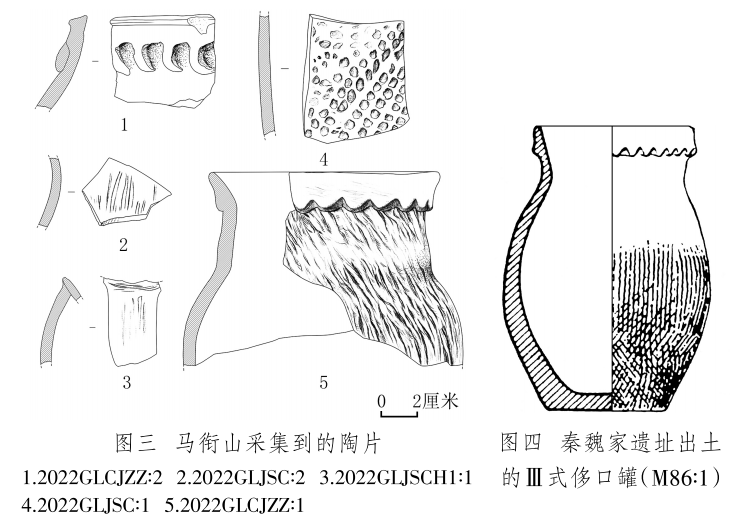 陶片 2片,2022GLCJZZ∶1,罐殘片,夾砂紅陶,腹部以下缺失。侈口,上有煙熏痕跡。短頸,頸上部有一圈鋸齒狀凸飾,鼓腹,頸部和腹部滿飾粗繩紋。復原口徑12、器壁厚0.6~1、殘高10厘米(圖三,5)。與秦魏家遺址出土的齊家文化Ⅲ式侈口罐(圖四)[16]形制相似。2022GLCJZZ∶2,罐口沿殘片,夾砂紅陶。口沿下有月牙狀附加堆紋??谘貧堥L5.3、殘高4.8、厚0.7厘米(圖三,1)。