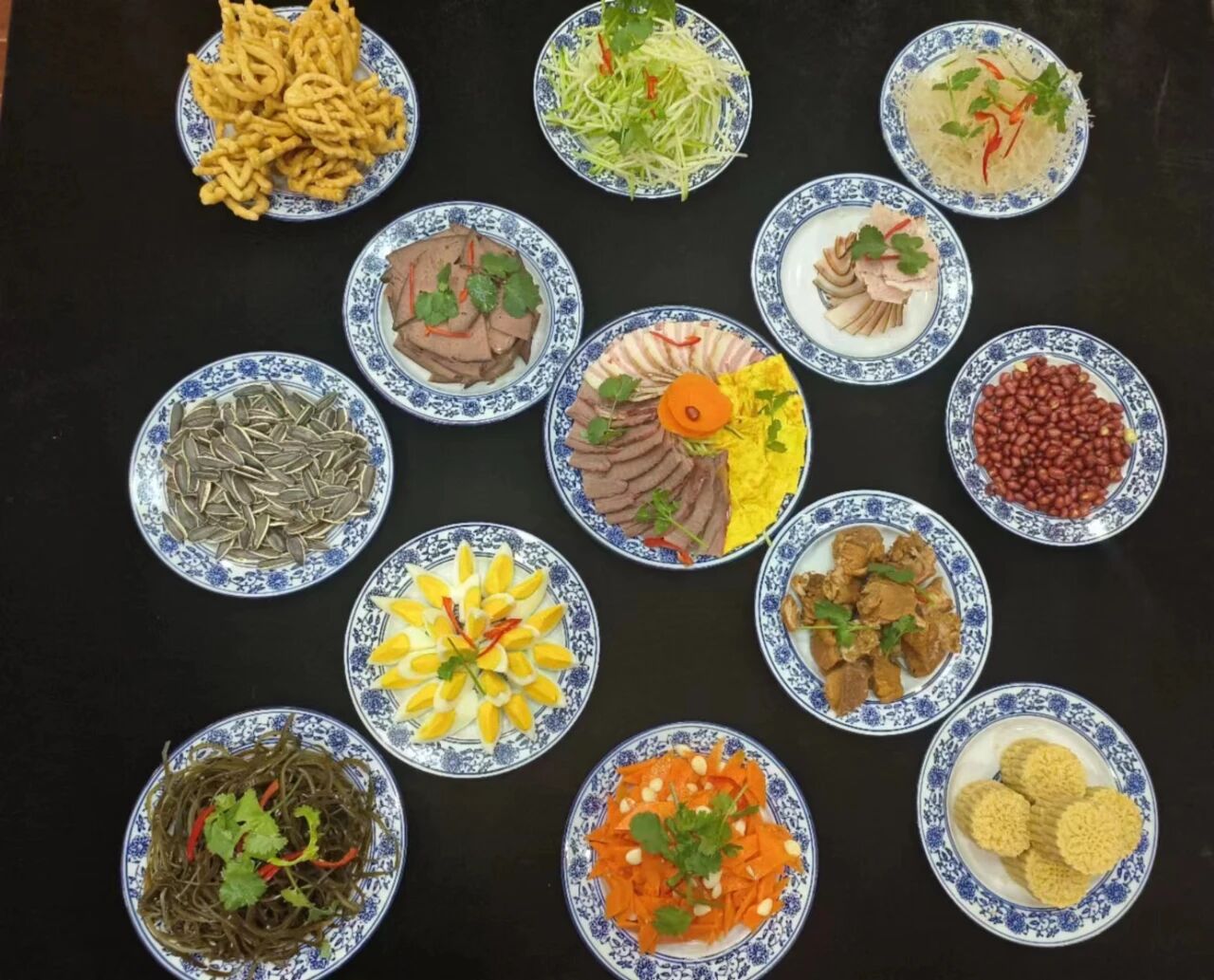 ——“十三花”,寓意胡太后以民為本的執(zhí)政理念;城內(nèi)四個(gè)葷菜,寓意人民四季安康、幸福美滿;骨頭碟和懸肉碟,寓意父骨母血、尊老孝親;肝子碟和雞蛋碟,寓意肝膽相照、心心相??;四個(gè)水菜碟子水圍城,寓意順風(fēng)順?biāo)⑺姆狡桨?;城外瓜籽花生碟,寓意多子多福、多祿多壽;路食和果子,寓意衣豐食足、一路平安;最中間一個(gè)大碟全盤(pán)為中心,寓意團(tuán)結(jié)聚力、天下一心。