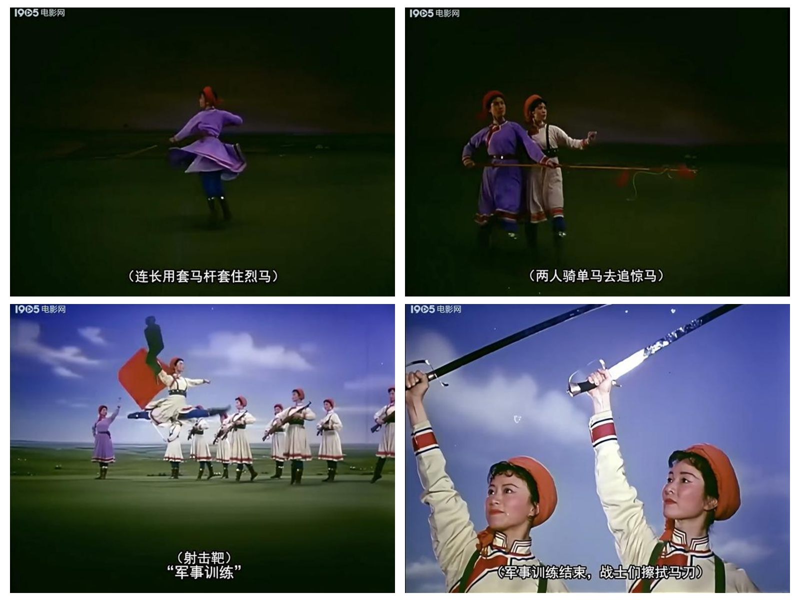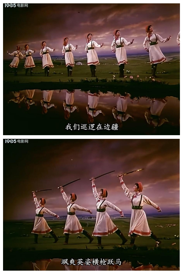 《草原女民兵》最初作為舞臺舞蹈,其美學特質(zhì)建立在現(xiàn)場性、即時性與三維空間性之上。而當它通過《百花爭艷》的鏡頭被重新詮釋時,經(jīng)歷了一場深刻的美學轉換。電影不僅記錄了這一舞蹈,更通過其特有的語言系統(tǒng),對舞蹈進行了二次創(chuàng)作與美學升華。