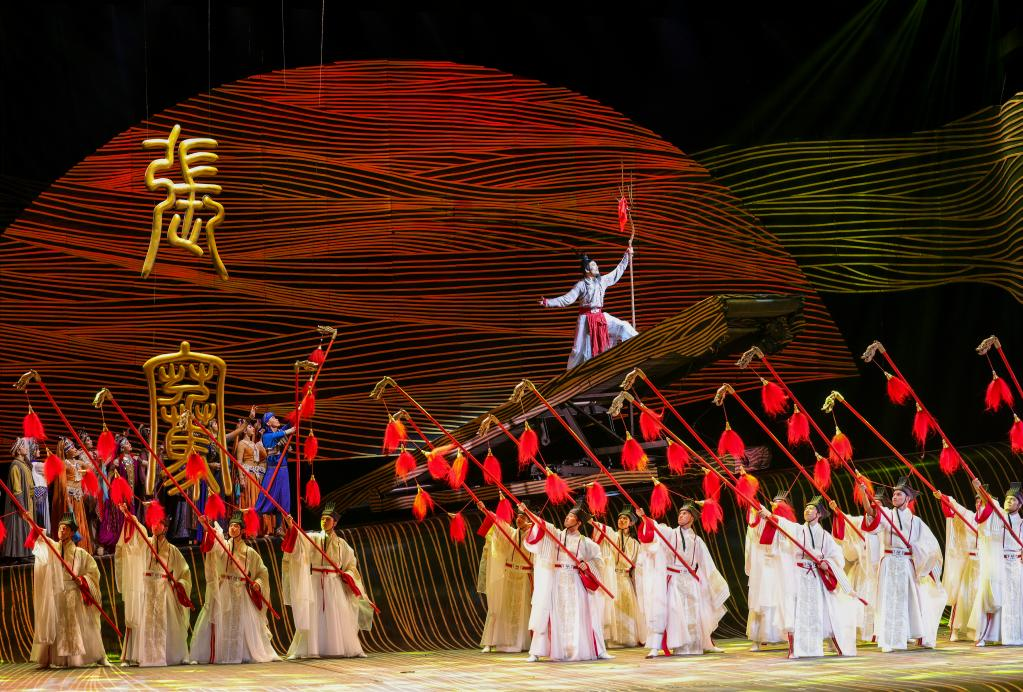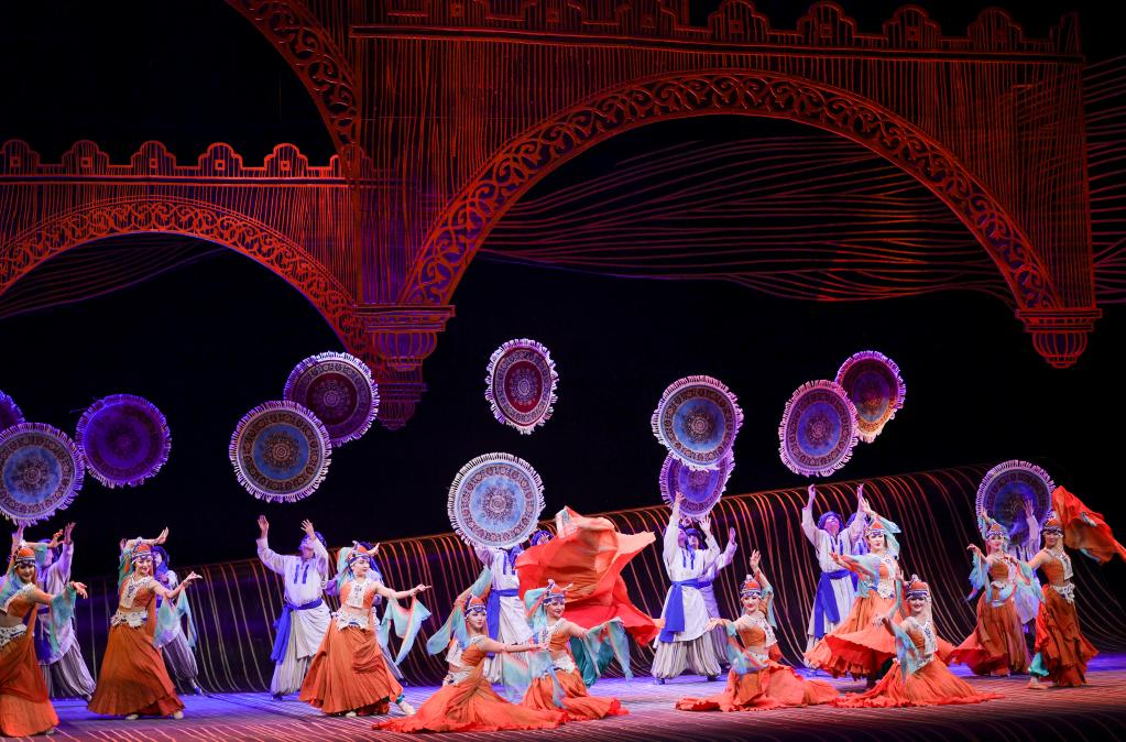 10月27日晚,在烏魯木齊文化中心大劇院,演員在舞劇《張騫》中表演。 10月27日晚,以漢代張騫出使西域?yàn)樗{(lán)本創(chuàng)作的重大歷史題材舞劇《張騫》,在烏魯木齊文化中心大劇院首演。該劇由《授節(jié)》《守節(jié)》《傳節(jié)》《使節(jié)》四幕組成,演繹了張騫出使西域的“鑿空之旅”,展現(xiàn)了各民族廣泛交往、全面交流、深度交融的生動(dòng)場(chǎng)景。 新華社記者 王菲 攝