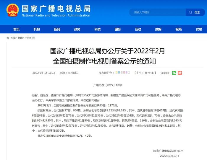 3月15日,國(guó)家廣播電視總局網(wǎng)站刊發(fā)關(guān)于2022年2月全國(guó)拍攝制作電視劇備案公示的通知(以下簡(jiǎn)稱(chēng)通知)。其中顯示,2022年2月,全國(guó)電視劇拍攝制作備案公示的劇目共33部、1176集。
