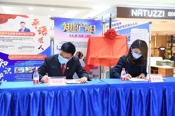 城關(guān)區(qū)法院與居然之家萬佳天水路店,就設(shè)立“知識產(chǎn)權(quán)司法保 護示范基地”及日常工作的詳細(xì)內(nèi)容簽訂備忘錄。記者 李洋 攝