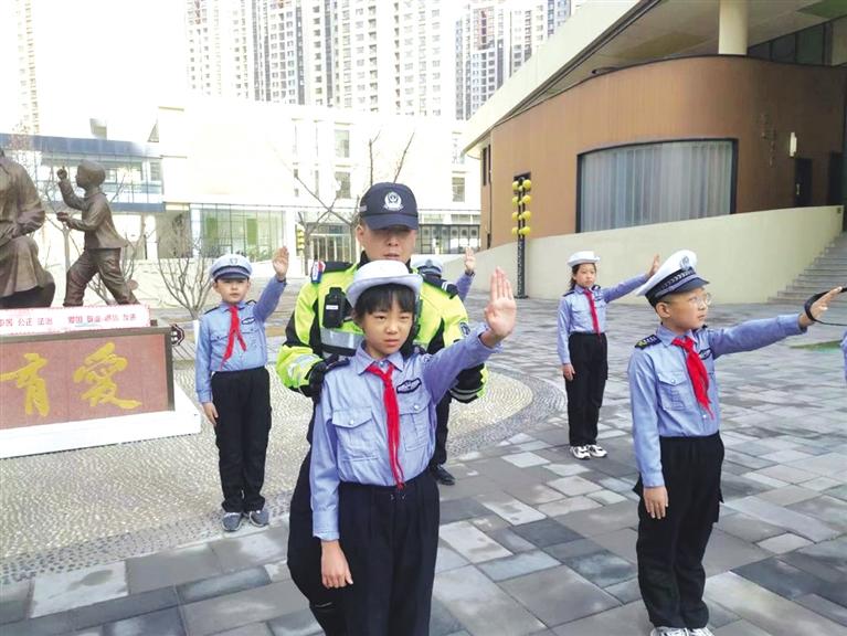 活動中,交警針對學(xué)生年齡特點(diǎn)和認(rèn)知特征,一邊一招一式地演示,一邊講解每一個(gè)指揮手勢的要領(lǐng)和含義,讓同學(xué)們在邊學(xué)邊練的感性實(shí)踐中,加深對交通安全常識的理解與記憶。