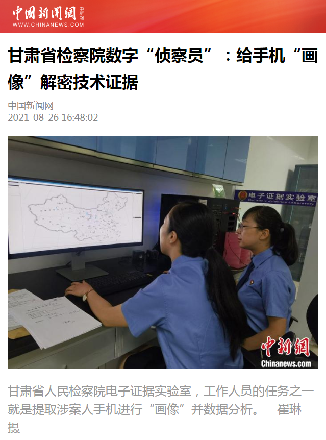 2021年8月26日,中國新聞網發(fā)布新聞《甘肅省檢察院數字“偵察員”:給手機“畫像”解密技術證據》。