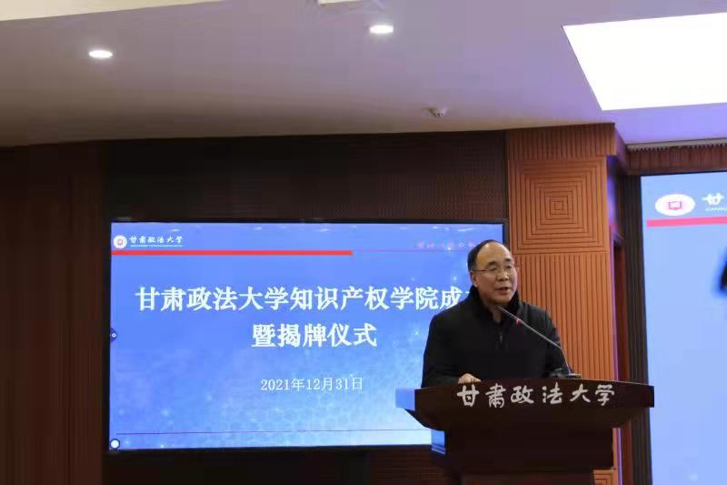 一元復(fù)始、萬(wàn)象更新;奮楫揚(yáng)帆,逐夢(mèng)前行。12月31日,甘肅政法大學(xué)知識(shí)產(chǎn)權(quán)學(xué)院成立暨揭牌儀式在明法講堂舉行,這是我省高校正式成立的第一個(gè)知識(shí)產(chǎn)權(quán)學(xué)院。甘肅省市場(chǎng)監(jiān)管局黨組成員、副局長(zhǎng)、省知識(shí)產(chǎn)權(quán)局局長(zhǎng)何文濤,甘肅省高級(jí)人民法院審委會(huì)委員、二級(jí)高級(jí)法官尹秉文,甘肅政法大學(xué)黨委書記馬建東,黨委副書記、校長(zhǎng)李玉基出席揭牌儀式,校黨委委員、副校長(zhǎng)焦盛榮主持揭牌儀式。