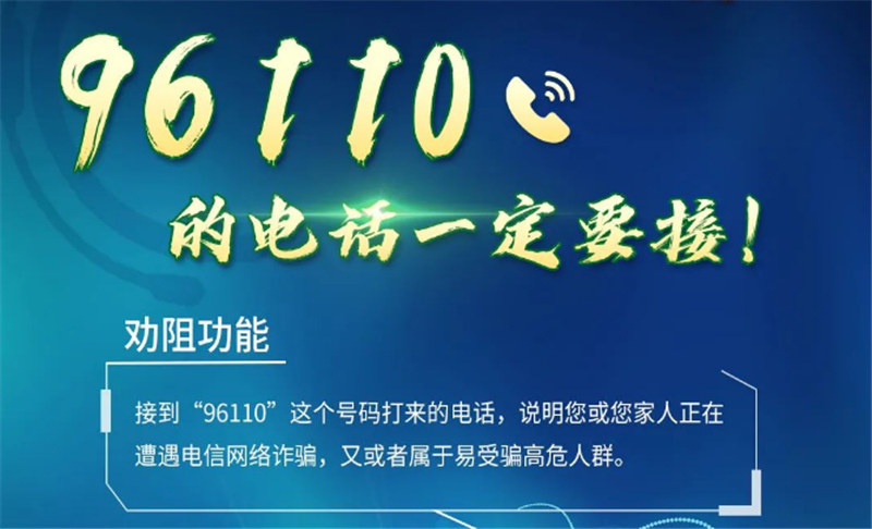 公安機(jī)關(guān)提醒:96110是官方預(yù)警勸阻專線,如接到“96110”號碼來電,說明機(jī)主本人或其家人正遭遇電信網(wǎng)絡(luò)詐騙,請一定及時(shí)接聽并耐心聽取民警的勸阻提示,避免上當(dāng)受騙。