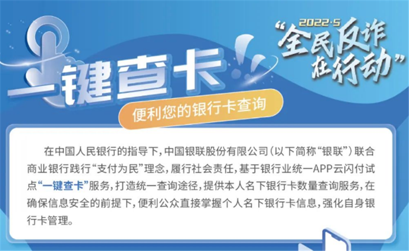 為解決群眾對于跨行銀行卡賬戶查詢的訴求,2021年12月,人民銀行指導(dǎo)中國銀聯(lián)股份有限公司聯(lián)合商業(yè)銀行基于銀行業(yè)統(tǒng)一APP云閃付試點(diǎn)“一鍵查卡”功能,打造統(tǒng)一查詢途徑,向公眾提供銀行卡數(shù)量、每張卡的銀行名稱、借貸記屬性、脫敏卡號等信息的查詢,在確保信息安全的前提下,便利公眾直接掌握個人名下銀行卡信息,強(qiáng)化自身銀行卡管理。