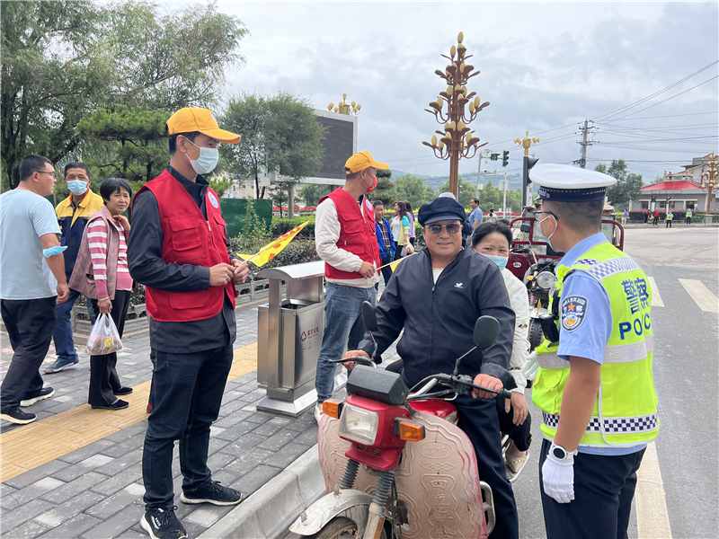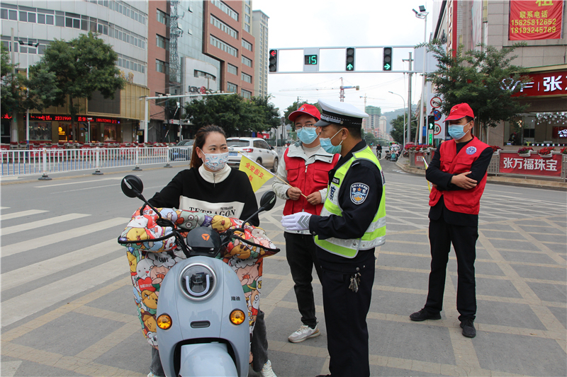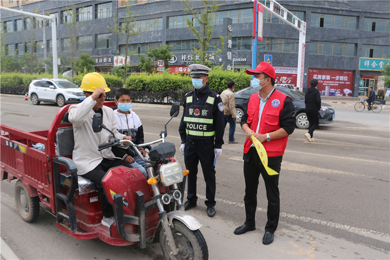 9月28日上午,參加“駕駛?cè)藢W(xué)習(xí)教育體驗(yàn)”活動(dòng)的記滿分駕駛?cè)苏诟拭C定西岷縣小南門十字路口對(duì)不文明交通行為認(rèn)真的進(jìn)行著勸導(dǎo)。