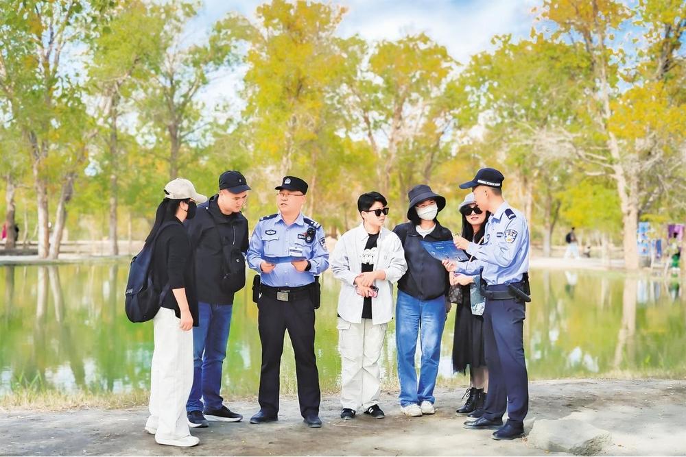同時,運(yùn)用智慧警務(wù)加強(qiáng)對景區(qū)人流量的動態(tài)掌握,適時調(diào)整巡防策略,在林區(qū)、夜市、游樂場等關(guān)鍵部位,民輔警利用大喇叭播報安全提示、面對面宣講等方式,有針對性開展防火防盜、交通安全、預(yù)防電詐等安全知識宣傳,向游客傳播“胡楊精神”、講好金塔故事,用“零距離”服務(wù)、全時空守護(hù)提升游客獲得感、幸福感和滿意度。