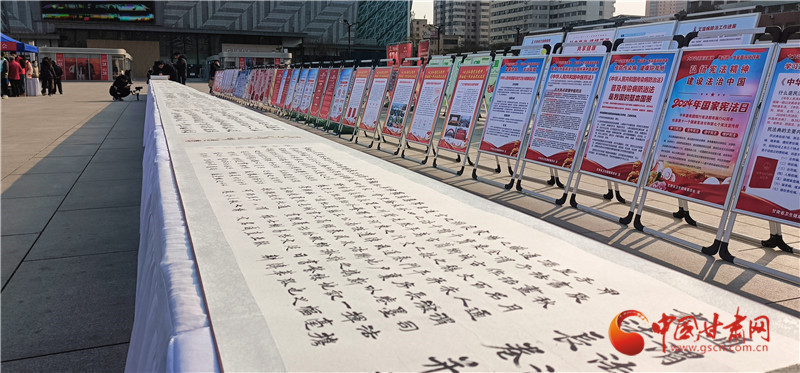 活動(dòng)現(xiàn)場(chǎng),省委宣傳部、省委政法委、省法院、省檢察院等20余家單位結(jié)合行業(yè)實(shí)際,宣傳憲法,普及法律知識(shí),為群眾提供法律咨詢(xún)。為了豐富普法載體,讓群眾在互動(dòng)參與中學(xué)習(xí)法律知識(shí),活動(dòng)展出了由定西市通渭縣司法局聯(lián)合書(shū)法家、師生群體、法官、檢察官、公安民警等各行各業(yè)工作人員創(chuàng)作的百米《書(shū)·法》長(zhǎng)卷,鐫刻法治精神,書(shū)寫(xiě)法律法規(guī)。現(xiàn)場(chǎng)還表演了精彩的文藝節(jié)目。