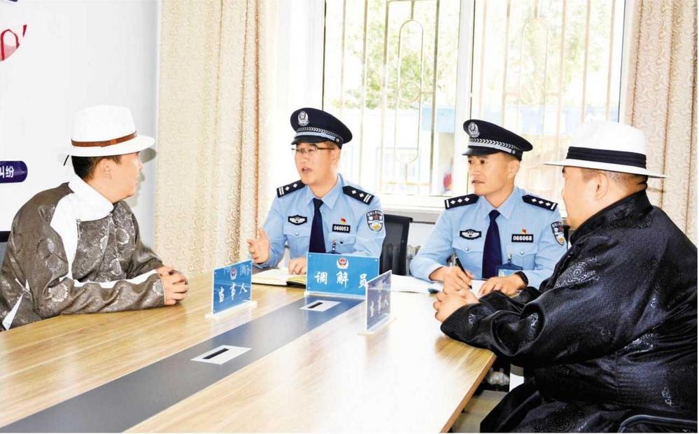 肅北縣公安局黨城派出所民警為牧民調解矛盾糾紛(2024年5月21日拍攝)。 肅北縣委政法委供圖
