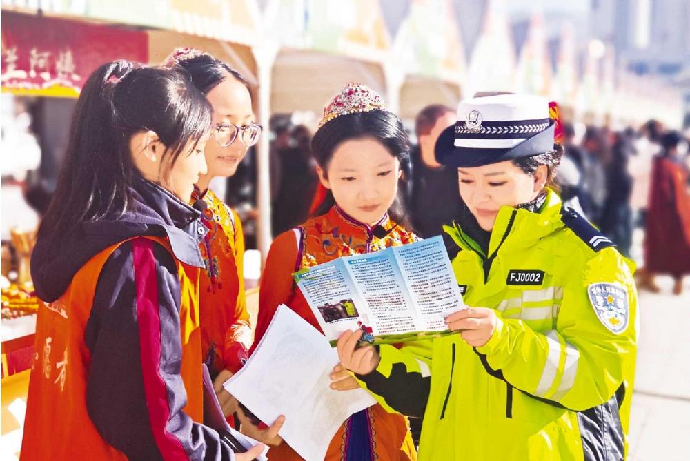 民警向群眾講解交通安全知識(shí)。11月27日,廣河縣公安局交管大隊(duì)民警走進(jìn)齊家文化廣場(chǎng),利用戲曲進(jìn)鄉(xiāng)村文藝匯演的有利契機(jī)開(kāi)展交通安全系列宣傳活動(dòng)。新甘肅·甘肅法治報(bào)通訊員 汪洋 攝