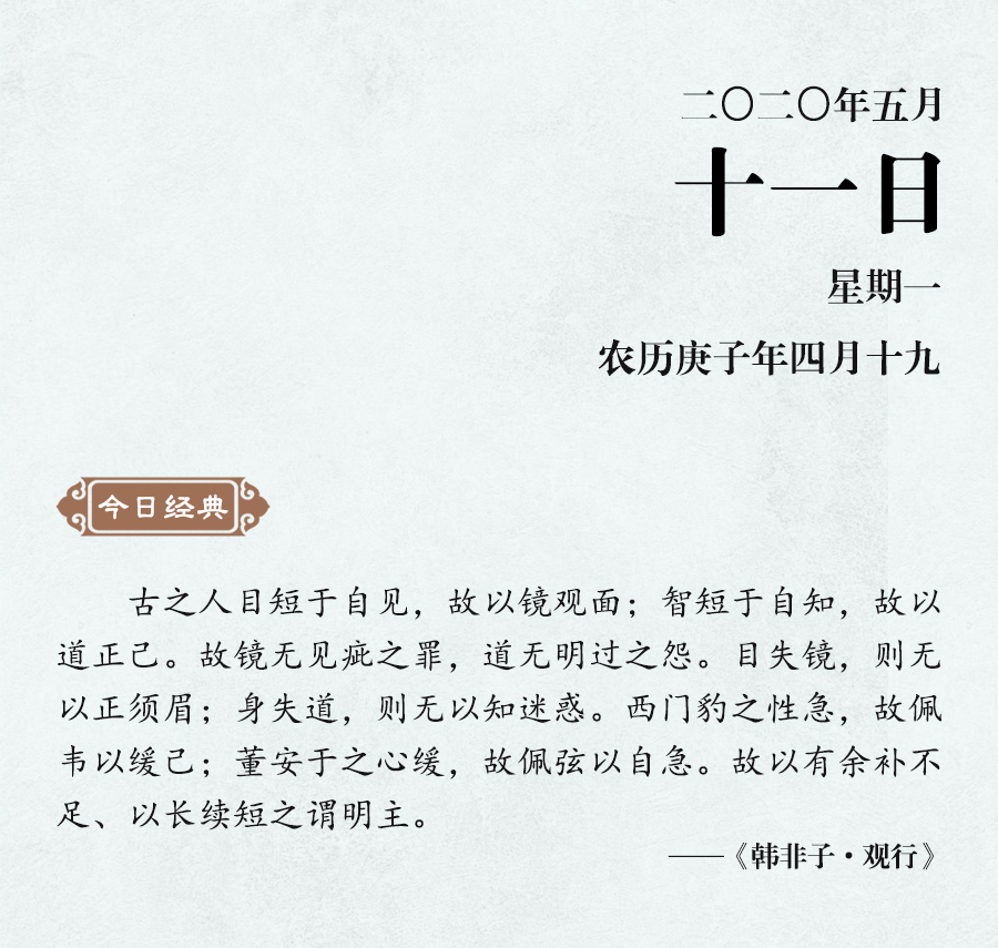 《老子》說:“知人者智,自知者明。”如果不能很好地認(rèn)識到自己的長處和短處,就不能透徹地了解事物。韓非進(jìn)一步說:“目短于自見,故以鏡觀面;智短于自知,故以道正己。”無論是明君還是賢人,都要明確認(rèn)識到自身的不足,如此才能自知自見。“目失鏡則無以正須眉,身失道則無以知迷惑。”這既是說自見的局限,也是說自知的重要。韓非舉例說,魏國的西門豹因?yàn)樾愿窦痹?,所以佩戴柔軟的皮帶來提醒自己;董安于因?yàn)樾宰雍苈耘宕骺嚲o的弓弦來激勵自己,這兩位都是能夠自知不足的人。
