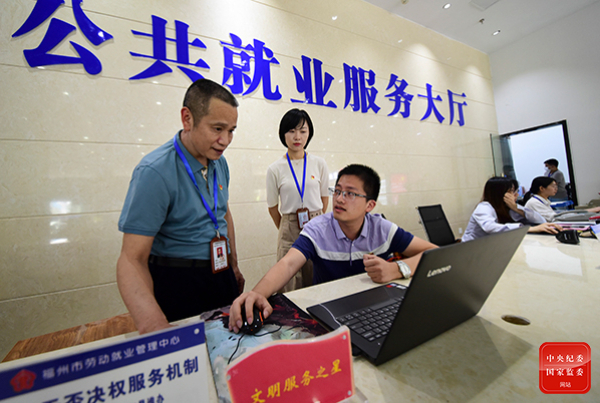 連日來,福建省福州市紀(jì)委監(jiān)委駐市委組織部紀(jì)檢監(jiān)察組深入市人社局下屬單位、有關(guān)企業(yè)調(diào)研督查“穩(wěn)崗就業(yè)”工作推進(jìn)落實(shí)情況。圖為紀(jì)檢監(jiān)察組成員在福州市公共就業(yè)服務(wù)大廳,對(duì)相關(guān)工作進(jìn)行調(diào)研監(jiān)督。李德鄰 攝