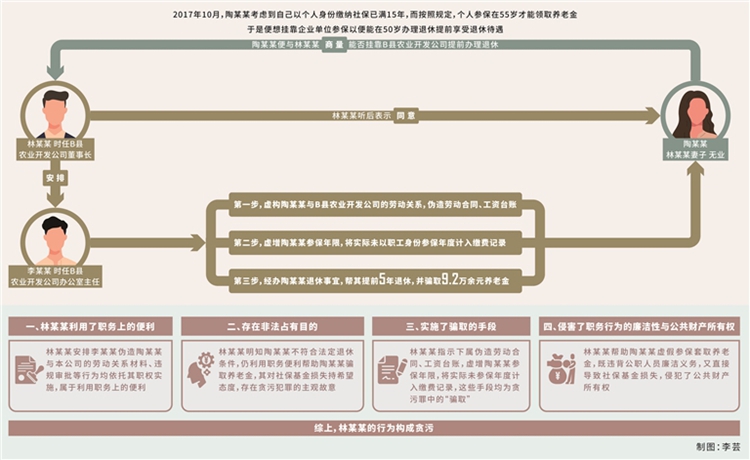 貪污罪。2017年10月,林某某妻子陶某某(無業(yè),另案處理)考慮到自己以個人身份繳納社保已滿15年,而按照規(guī)定,個人參保在55歲才能領(lǐng)取養(yǎng)老金,于是便想掛靠企業(yè)單位參保,以便能在50歲辦理退休、提前享受退休待遇?;诖耍漳衬潮闩c林某某商量能否掛靠B縣農(nóng)業(yè)開發(fā)公司提前辦理退休,林某某聽后表示同意,并利用擔(dān)任該公司董事長的職務(wù)便利,在明知陶某某不符合提前退休條件的情況下,安排時任公司辦公室主任李某某(另案處理)虛構(gòu)勞動關(guān)系,為陶某某以該公司職工身份辦理退休事宜。手續(xù)辦理過程中,李某某按林某某的安排,偽造B縣農(nóng)業(yè)開發(fā)公司與陶某某的《勞動合同書》,經(jīng)林某某本人簽字后加蓋公司合同專用章,陶某某憑該合同在B縣人力資源和社會保障局進行勞動合同鑒證。完成鑒證后,陶某某順利以B縣農(nóng)業(yè)開發(fā)公司職工身份參保,當(dāng)年度公司為其繳納職工養(yǎng)老保險、工傷保險、失業(yè)保險、醫(yī)療保險共計7649.76元。其間,陶某某從未在B縣農(nóng)業(yè)開發(fā)公司上班,也未向公司補繳為其繳納的社保費用。
