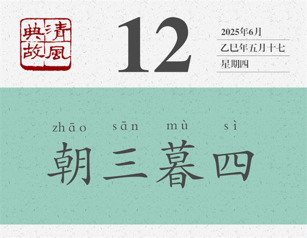 《列子·黃帝》:“宋人有狙公者,愛狙,養(yǎng)之成群,能解狙之意,狙亦得公之心。損其家口,充狙之欲。俄而匱焉,將限其食??直娋阎贿d于己也,先誑之曰:‘與若芧,朝三而暮四,足乎?’眾狙皆起而怒。俄而曰:‘與若芧,朝四而暮三,足乎?’眾狙皆伏而喜。”