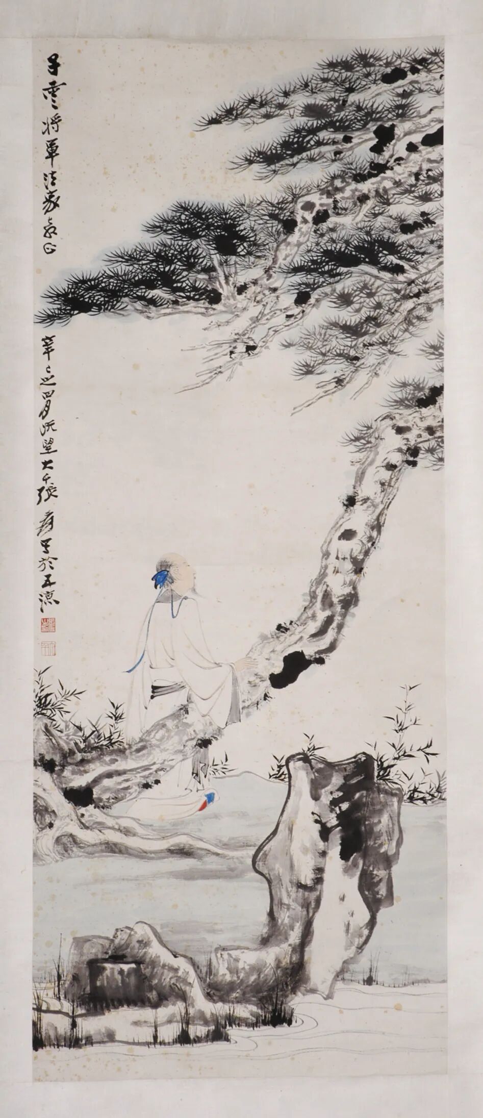 這幅作品在構(gòu)圖、筆墨、設色等方面都展現(xiàn)了極高造詣。畫面采用經(jīng)典的“S”形構(gòu)圖,古松自左下方向右上方蜿蜒伸展,形成強烈的動勢與韻律感。松樹以“釘頭鼠尾”描法勾勒,筆觸蘊含書法韻律:起筆如楷書之頓挫,行筆如草書之流暢,收筆若隸書之含蓄。這種源自陳洪綬而自出新意的筆法,既表現(xiàn)松樹的蒼勁質(zhì)感,又暗合中國書法力透紙背的審美要求。設色上通過淡墨層層渲染,營造“素以為絢”的審美境界。畫面以水墨為主調(diào),僅在高士衣襟處施以淡赭石,松針間點綴少許石綠。這種惜色如金的處理方式,既保持文人畫“淡而不厭”的審美特質(zhì),又通過微妙色彩對比增強藝術(shù)感染力。